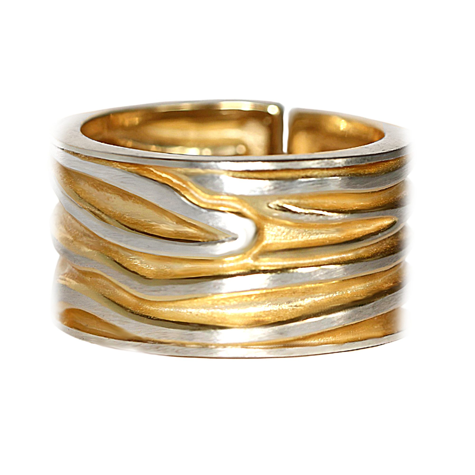 Dieser Ring aus 925er Sterlingsilber mit 585 Vergoldung ist von den natürlichen Linien inspiriert, die Wind und Wasser im Sand hinterlassen. Wie bei einer Düne oder bei Ebbe zeigt die Oberfläche sanfte Wellen und organische Formen. Jeder Ring ist handgefertigt und leicht individuell – ein echtes Unikat. Der Ring ist für den täglichen Gebrauch geeignet, wasserfest und nickelfrei. Er ist innerhalb der folgenden Basisgrössen verstellbar: - XXS-S: passt im Regelfall allen mit dieser Kleidungsgrösse. Ringgrössen 49-52 - M-L: passt im Regelfall allen mit dieser Kleidungsgrösse. Ringgrössen 53-57 - L-XXL: passt im Regelfall allen mit dieser Kleidungsgrösse. Ringgrössen 58-62 Eingetragenes registriertes Design von Villa Sorgenfrei. Unser exklusiv gestalteter Schmuck, handgefertigt in unserer kleinen Berliner Werkstatt, kommt immer in einer speziell gebrandeten, plastikfreien Verpackung. Mit Ihrem Kauf unterstützen Sie ein unabhängiges kleines Familienunternehmen. Mit der Verwendung von recycletem Silber, plastikfreier Verpackung sowie CO²-Kompensation schonen wir Umwelt und Klima. Zur eindeutigen Identifikation unseres Produkts dient die jeweils angegebene SKU-Artikelnummer sowie der Name und die Beschreibung des Schmuckstücks in diesem Angebot. Hersteller und Verkäufer des Schmuckstücks ist die Villa Sorgenfrei Schmuckmanufaktur Gmbh, Adresse und Kontaktinfo: Freienwalder Str. 17, 13055 Berlin, Tel. 030 3512 8209, Email villa@villamail.de; Verantwortlicher: Geschäftsführender Gesellschafter Dirk Dotzert.