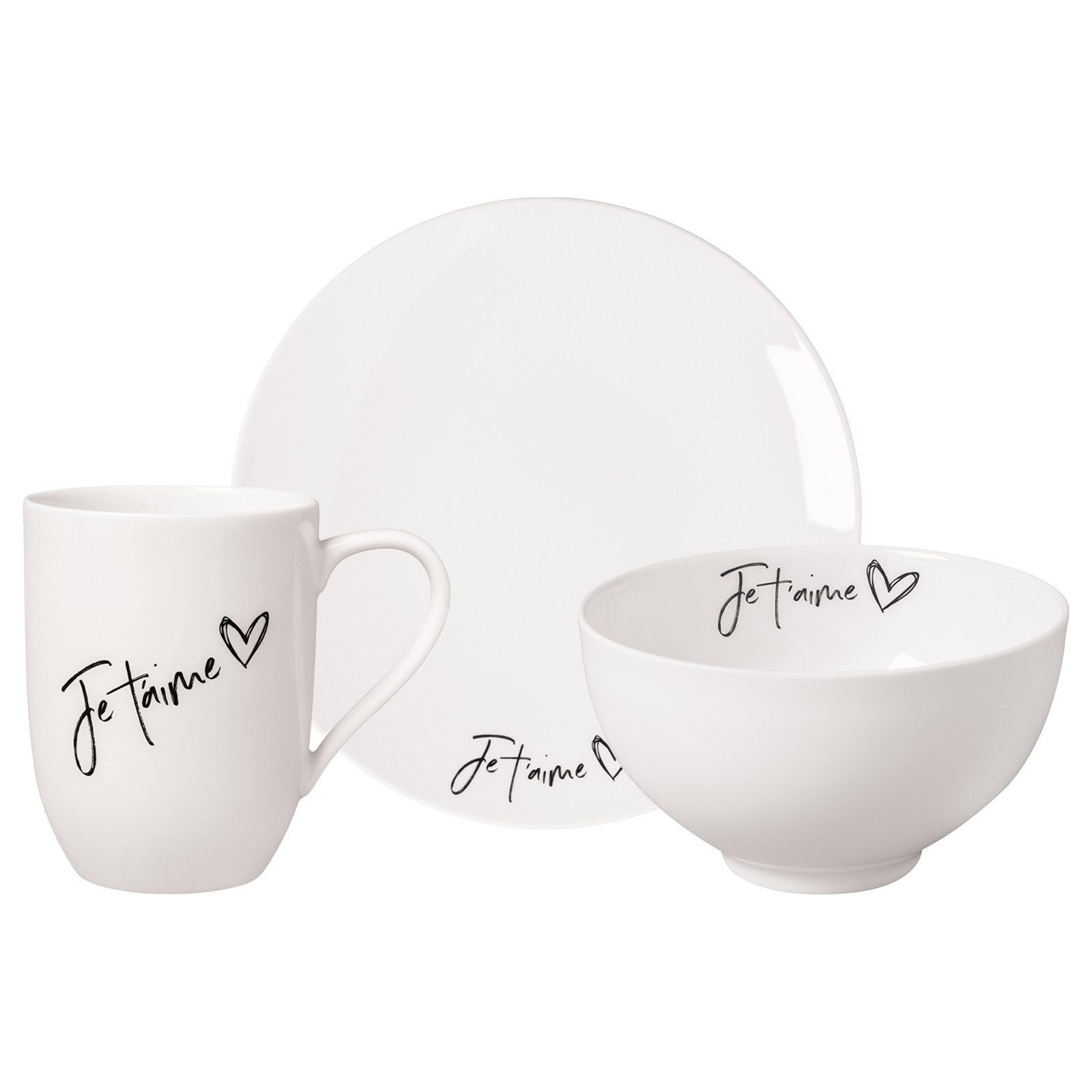LIEFERUMFANG: 1x Statement Frühstücks-Set 3-teilig, Motiv: Je t'aime, enthalten: 1x Frühstücksteller, 1x Bol und 1x Henkelbecher, Material: Premium-Porzellan, Farbe: Weiß