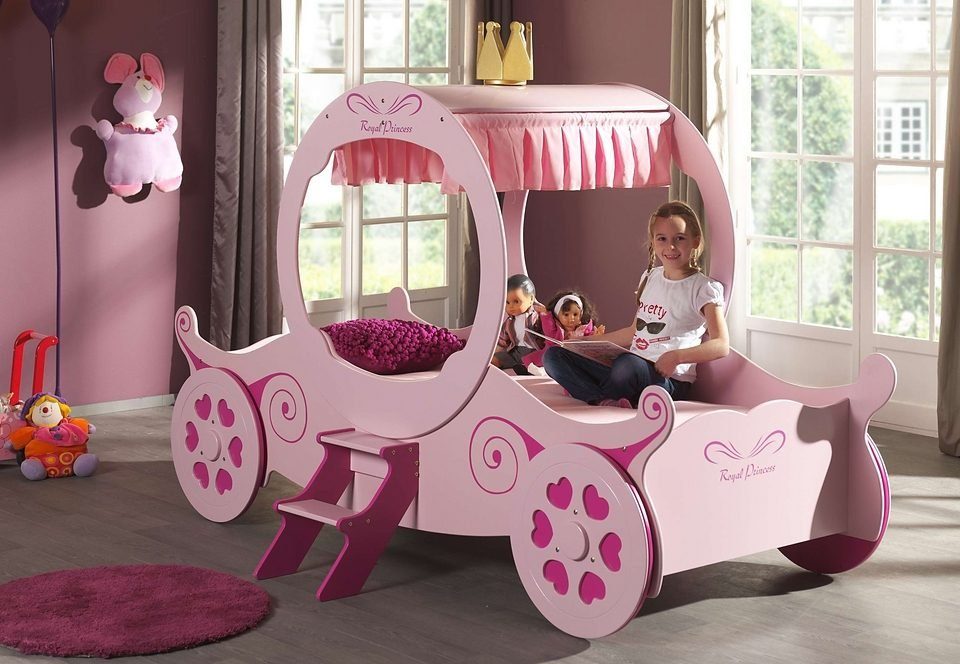 Wissenswertes | Dieses schöne Kutschenbett ist der Traum in jedem Kinderzimmer. Aus hochwertigem FSC®-zertifiziertem MDF gefertigt, die Oberflächen sind rosa lackiert und pinkfarben abgesetzt. Das Bett ist mit viel Liebe zum Detail gestaltet worden. Die kleine Treppe ermöglicht einen leichten Ein- und Ausstieg. Der Aufbau bietet rechts und links ein großes Fenster zum hindurch schlüpfen. Die goldfarbene Krone und der pinkfarben Vorhang am Kutschendach, sowie die Räder mit herzförmigen Ausschnitten, pink hinterlegt, setzen optische Akzente. An den Bettseiten, wie auch am Kopf- und Fußteil befindet sich ein dekorativer Aufdruck in pink. Das Bett ist ein idealer Ort zum Träumen und Kuscheln. Впередe Produktinformationen: