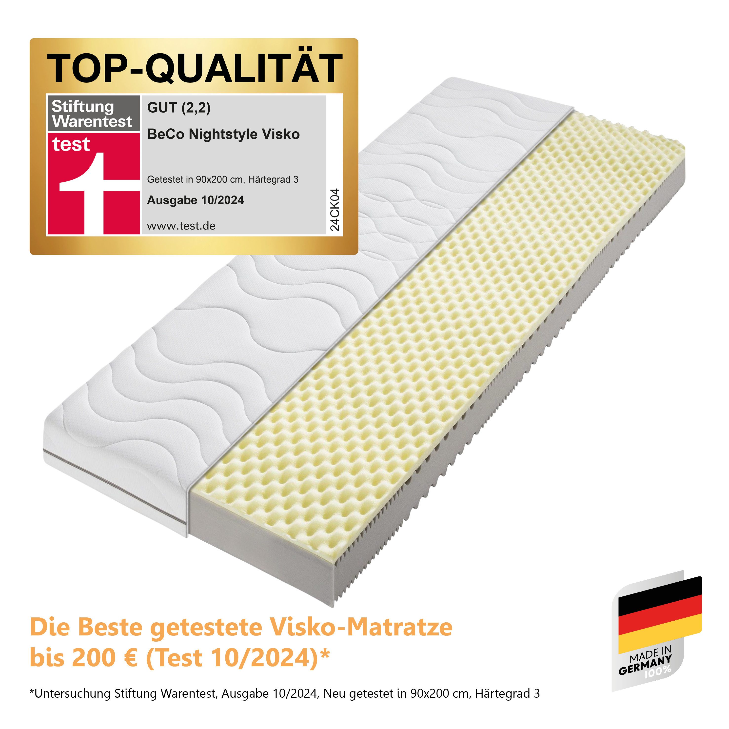 Ausgezeichnet von Stiftung Warentest: Die Beco Nightstyle Visko-Matratze wurde von der Stiftung Warentest in der Ausgabe 10/2024 mit der Note GUT (2,2) bewertet (getestet in 90x200 cm, H3, Ausgabe 10/2024). Ein klarer Beweis für die herausragende Qualität und den hohen Komfort der Matratze.