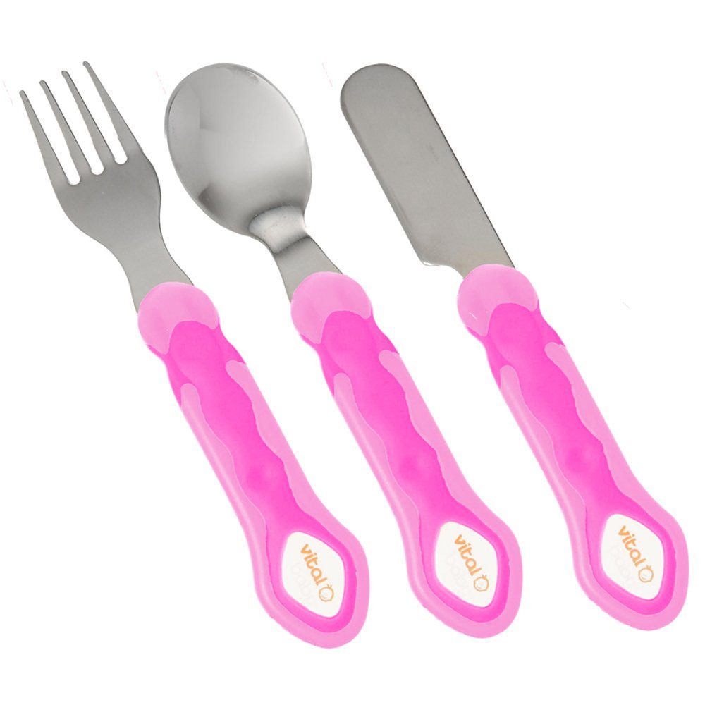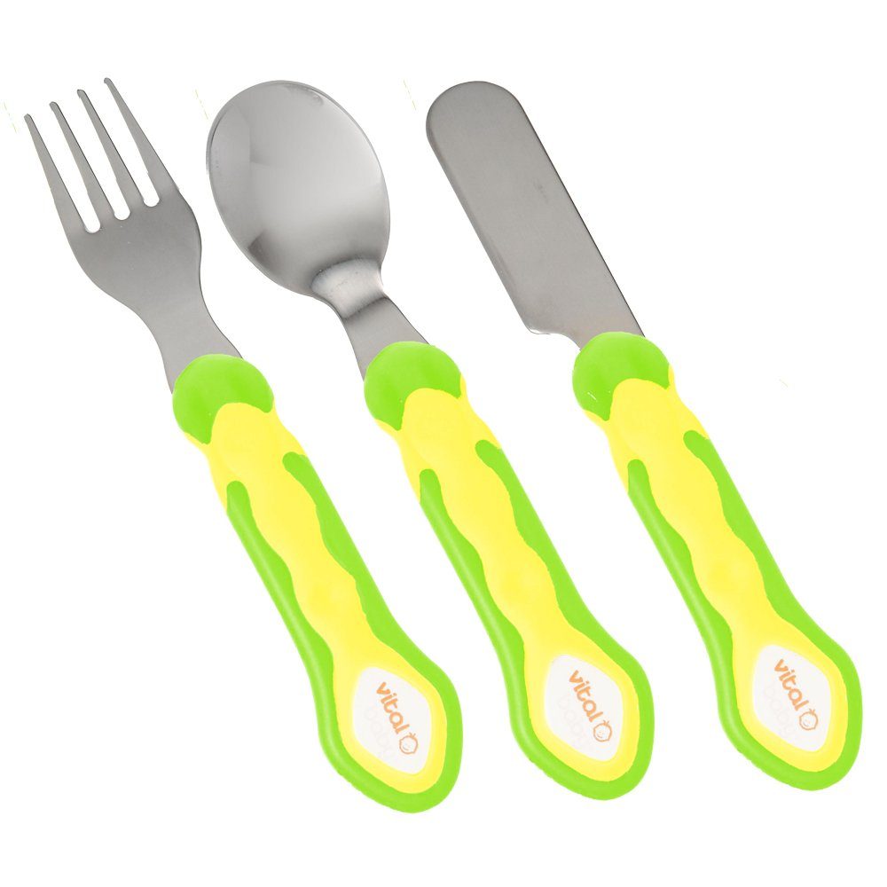 Mit Hilfe des Edelstahl-Besteck-Sets lernt das Kind leicht selbst zu essen. Die speziell geformten Griffe mit den weichen Einkerbungen erleichtern Ihrem Kind, die richtige Halteposition zu finden.