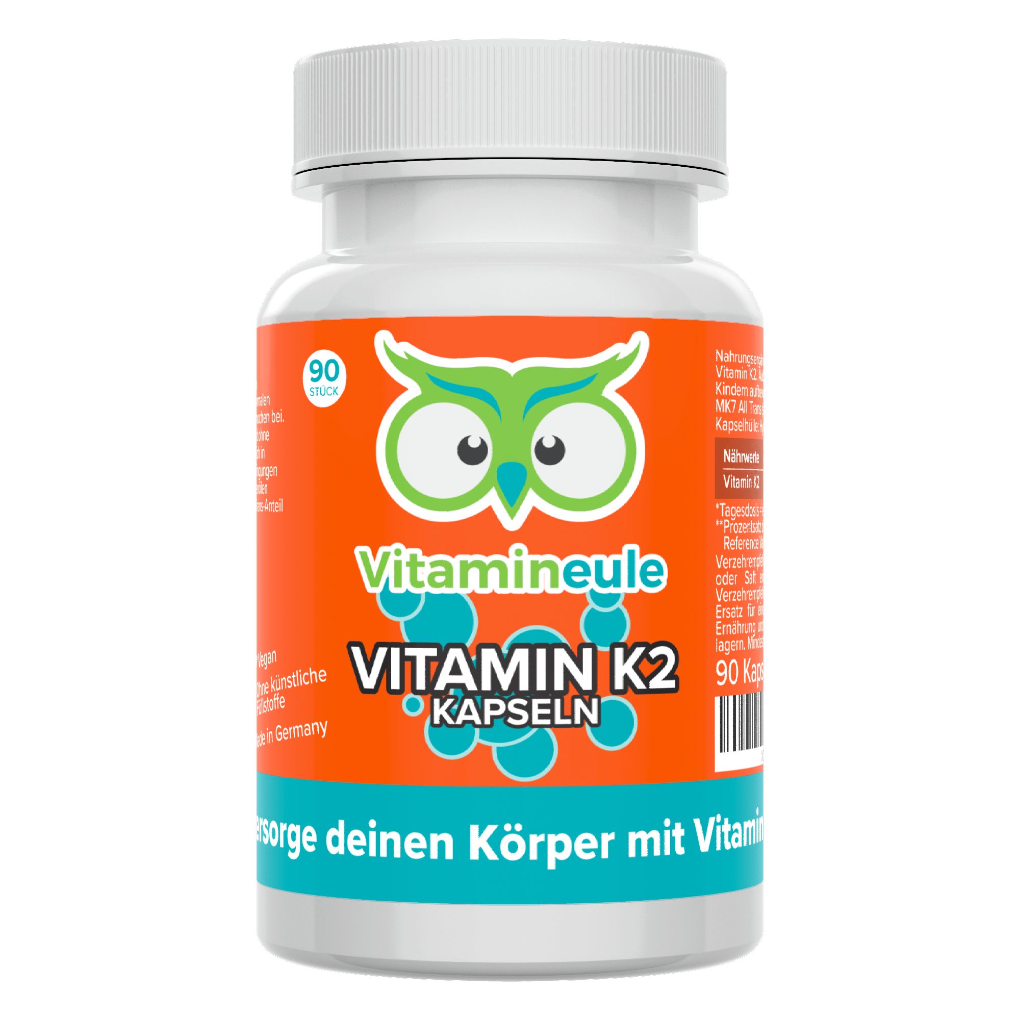 Unsere Vitamineule® Vitamin K2 Kapseln werden in Deutschland hergestellt und sind frei von künstlichen Zusatzstoffen. Viele Hersteller verwenden minderwertige Vitamin K2 Вариантыn, die komplett wirkungslos sind. In unseren Vitamin K2 Kapseln sind 200 µg reines Vitamin K2 in der effektivsten Form Mk7 All Trans enthalten, die der Körper am besten verwerten kann und gut verträgt. Unser Vitamin K2, auch Menachinon genannt, ist rein pflanzlicher Herkunft und enthält keine chemischen Bestandteile. Unsere Vitamin K2 Kapseln sind zu 100% vegan und für Kinder geeignet. Jede Charge wird einzeln von einem unabhängigen Labor getestet, um eine erstklassige Produktqualität zu gewährleisten. Wir empfehlen die Einnahme der Vitamin K2 Kapseln zusammen mit unseren Vitamineule® Vitamin D3 Kapseln.