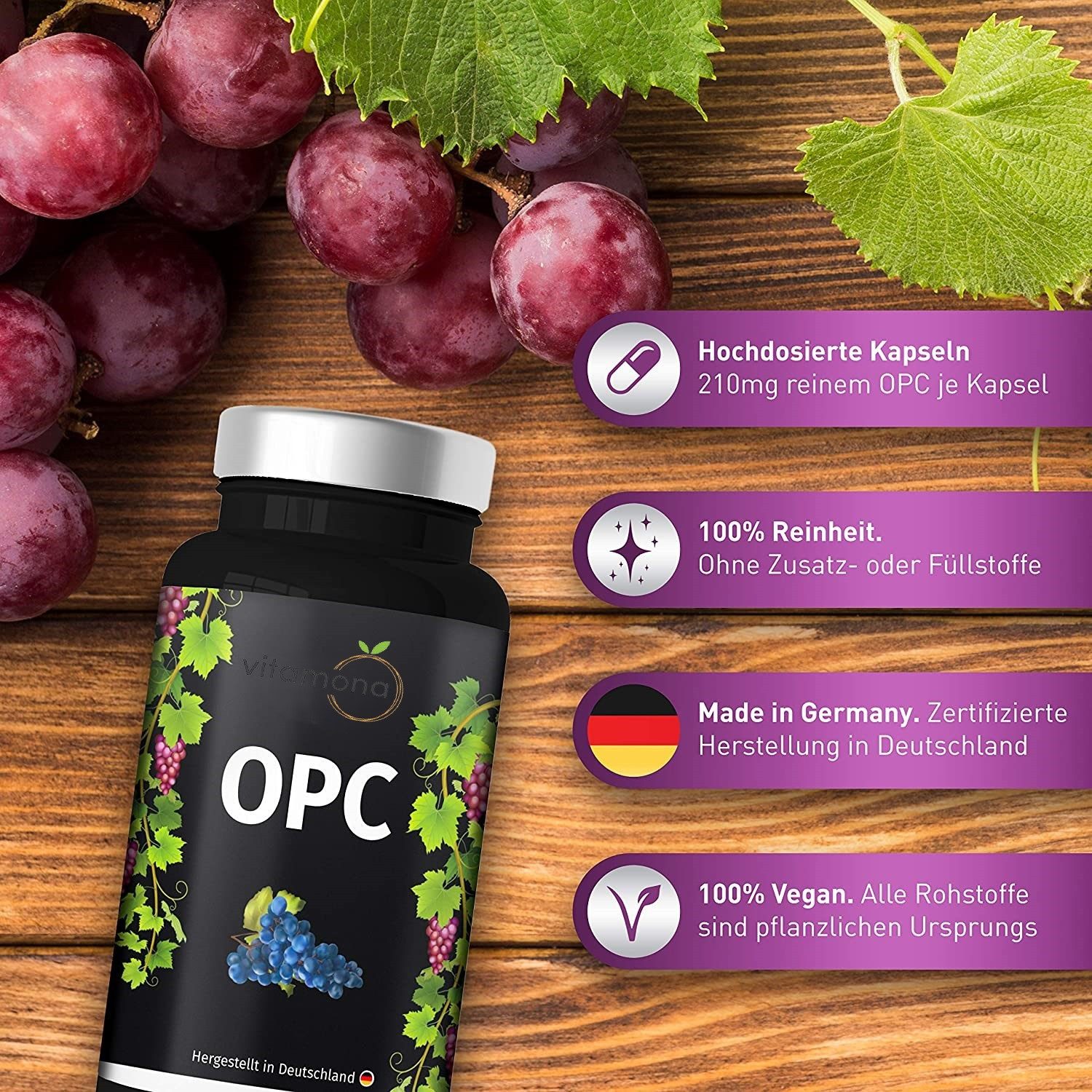 INNOVATIVER WIRKKOMPLEX : Wir setzen auf 60 hochdosierte vegane Kapseln mit jeweils 421 mg reinem Traubenkern-Extrakt und echten 210mg OPC gemessen nach HPLC. So werden Sie täglich mit qualitativ hochwertigem Traubenkerextrakt aus Frankreich versorgt. Für bis zu ganze 2 Monate, denn eine kleine Kapsel von Vitamona OPC deckt Ihren Tagesbedarf an OPC. 100% REINHEIT OHNE ZUSATZ- ODER FÜLLSTOFFE: Unsere Produkte sind stets frei von Magnesiumstearat, Magnesiumsalzen, Aromen, Farbstoffen, Stabilisatoren, Gelatine und selbstverständlich auch GMO-frei, laktosefrei, glutenfrei & ohne Konservierungsstoffe. Mit Vitamona Produkten erhalten Sie absolute Premium Produkte zu fairen Preisen! DEUTSCHE HERSTELLUNG & ABFÜLLUNG: Wir setzen uns selbst den höchsten Maßstab für Ihre Zufriedenheit. Unsere Produktionshallen in Deutschland sind streng geprüft und besitzen nur zertifizierte Anlagen, welche mit ISO sowie lebensmittelrechtlich notwendigem HACCP Zertifikat ausgezeichnet sind . Jeder Rohstoff ist zudem zertifiziert und wird im Labor analysiert. DEUTSCHE UNABHÄNGIGE NACHPRÜFUNG: Jedes unserer Produkte wir von einem unabhängigen Labor mikrobiologisch auf mesophile aerobi Gesamtkeimzahl, Enterobakterien, Schimmelpilze, Salmonellen, E.coli und auf Schwermetalle wie Blei, Cadmium und weitere untersucht. Diese Untersuchung wird von einem deutschen, nach DIN EN ISO/IEC 17025 zertifizierten Labor durchgeführt. 100% VEGAN: Unser Vitamona Traubenkernextrakt ist zu 100% vegan. Wir verwenden nur Rohstoffe pflanzlichem Ursprungs. Als Trennmittel wird Reisextrakt genutzt. Die Kapsel besteht aus rein pflanzlichen Stoffen. Warnhinweise Nahrungsergänzungsmittel stellen keinen Ersatz für eine abwechslungsreiche und ausgewogene Ernährung sowie für eine gesunde Lebensweise dar. Nicht für Kinder geeignet. Außerhalb der Reichweite von kleinen Kindern zu lagern. An einem trockenen Ort unter 25°C lagern. Bestandteile Traubenkernextrakt (95% Proanthocyanidine, 50% OPC), Füllstoff: Reismehl, Kapselhülle: Hydroxypropylmethylcellulose Gebrauchsanweisung Nehmen Sie täglich eine Kapsel mit ausreichend Wasser zu sich. Die empfohlene tägliche Verzehrmenge darf nicht überschritten werden.