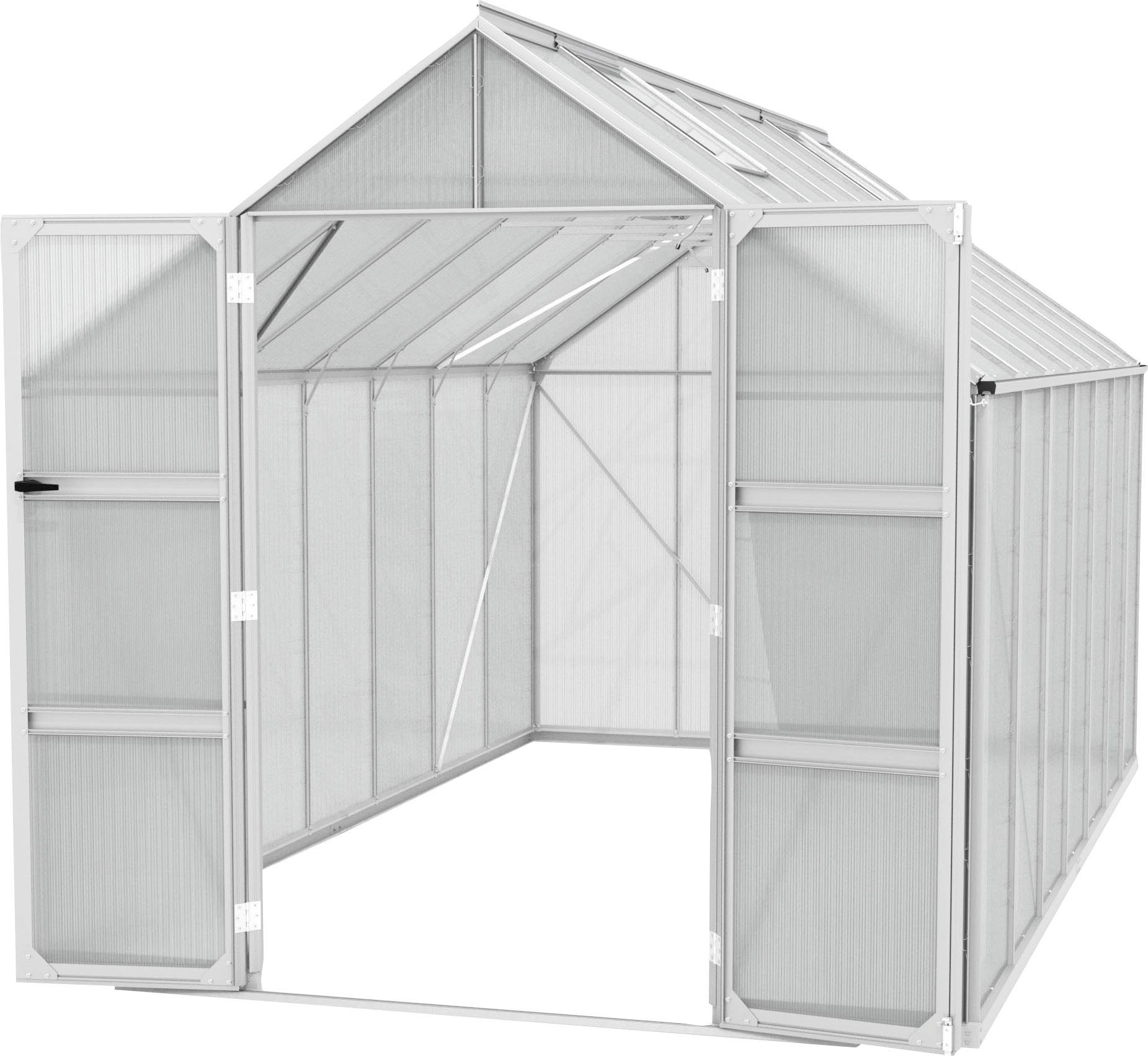 Weite und fast zwei Meter hohe Doppelflügeltüren sowie eine bodentiefe Türschwelle laden Hobbygärtner und Gäste geradezu ein, in diese großzügige Werkstätte mit dem Plus an Komfort einzutreten. Ob mit kristallklarem Sicherheitsglas (ESG) oder UV-stabilen Hohlkammerplatten - erhältlich in 4mm und 6 mm Stärke - verglast: Die Scheiben bzw. Platten erstrecken sich großflächig über die Seitenfelder. Welche Verglasung gewählt wird, entscheiden die Gärtner selbst: Komplett mit dem 3mm starken, bruchstabilen Sicherheitsglas ausgestattet, fügt sich ihr Domus elegant und wertig in ihren Garten – und bietet den Pflanzen viel Sonne. Das ist gut fürs Wachstum, erfordert aber je nach Sonneneinstrahlung auch den Einsatz von Schattierhilfen, um den Brennglaseffekt zu vermeiden. Wer sich darum nicht kümmern möchte, entscheidet sich für eine Варианты mit Hohlkammerplatten. Diese verbessern zudem die Isoliereigenschaften, sodass z.B. am Anfang und zum Ende der Gartensaison effizienter zugeheizt werden kann. Egal, ob in 4mm oder in 6 mm Stärke: Bei den Hohlkammerplatten können sich Kunden von Vitavia auf qualitativ hochwertiges Material verlassen: Die Polycarbonatplatten aus deutscher Herstellung sind aufgrund ihrer UV-Beschichtung haltbarer als herkömmliche Platten, und sind an den Längsseite geschlossen. So kann weniger Feuchtigkeit oder Schmutz eindringen, und die Kontaktpunkte zum Gewächshausprofil sind stabiler, weil am Rand keine Hohlkammern offen stehen, die leicht eingedrückt werden könnten. Das Domus ist in vier verschiedenen Größen mit Grundflächen von 6,7 bis 11,5 Quadratmetern und in drei verschiedenen Farben erhältlich. Zwei Dachfenster, Regenrinne und der Stahlfundamentrahmen gehören zur Serienausstattung.