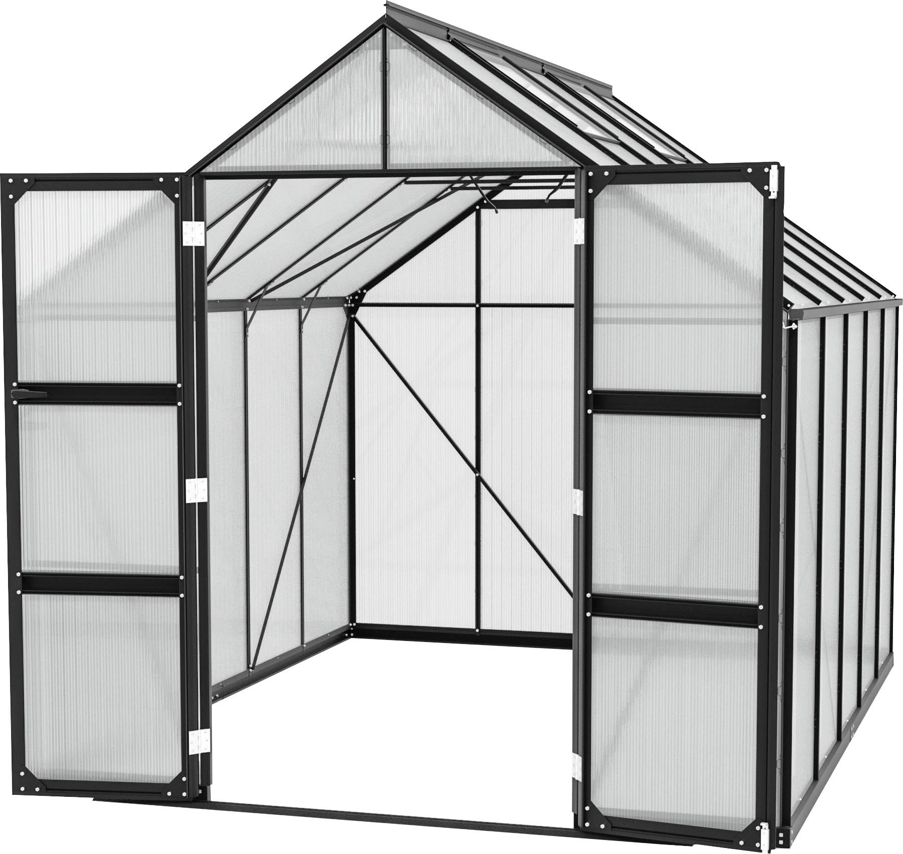 Weite und fast zwei Meter hohe Doppelflügeltüren sowie eine bodentiefe Türschwelle laden Hobbygärtner und Gäste geradezu ein, in diese großzügige Werkstätte mit dem Plus an Komfort einzutreten. Ob mit kristallklarem Sicherheitsglas (ESG) oder UV-stabilen Hohlkammerplatten - erhältlich in 4mm und 6 mm Stärke - verglast: Die Scheiben bzw. Platten erstrecken sich großflächig über die Seitenfelder. Welche Verglasung gewählt wird, entscheiden die Gärtner selbst: Komplett mit dem 3mm starken, bruchstabilen Sicherheitsglas ausgestattet, fügt sich ihr Domus elegant und wertig in ihren Garten – und bietet den Pflanzen viel Sonne. Das ist gut fürs Wachstum, erfordert aber je nach Sonneneinstrahlung auch den Einsatz von Schattierhilfen, um den Brennglaseffekt zu vermeiden. Wer sich darum nicht kümmern möchte, entscheidet sich für eine Варианты mit Hohlkammerplatten. Diese verbessern zudem die Isoliereigenschaften, sodass z.B. am Anfang und zum Ende der Gartensaison effizienter zugeheizt werden kann. Egal, ob in 4mm oder in 6 mm Stärke: Bei den Hohlkammerplatten können sich Kunden von Vitavia auf qualitativ hochwertiges Material verlassen: Die Polycarbonatplatten aus deutscher Herstellung sind aufgrund ihrer UV-Beschichtung haltbarer als herkömmliche Platten, und sind an den Längsseite geschlossen. So kann weniger Feuchtigkeit oder Schmutz eindringen, und die Kontaktpunkte zum Gewächshausprofil sind stabiler, weil am Rand keine Hohlkammern offen stehen, die leicht eingedrückt werden könnten. Das Domus ist in vier verschiedenen Größen mit Grundflächen von 6,7 bis 11,5 Quadratmetern und in drei verschiedenen Farben erhältlich. Zwei Dachfenster, Regenrinne und der Stahlfundamentrahmen gehören zur Serienausstattung.
