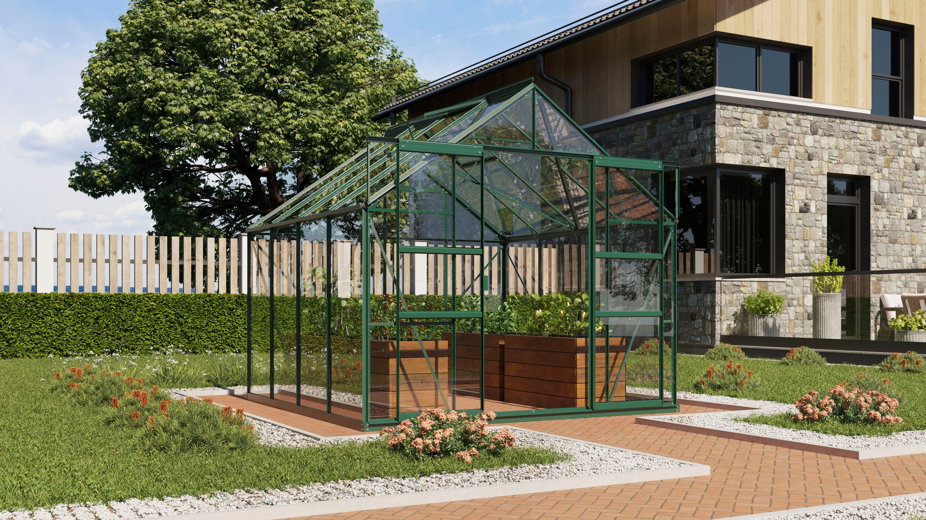 Durch sein großzügiges und offenes Design lädt das Mars den aktiven Gärtner zum Arbeiten und Genießen ein. So öffnen sich die breiten Doppelschiebetüren bis zu 1,22 m weit. Auch Traufen- udn Firsthöhen bieten mehr als Einstiegsnodelle. Bei der Verglasung kann zwischen ca. 3 mm starkem Sicherheitsglas, kristallklar (ESG) und Hohlkammerplatten (HKP) gewählt werden. Die Hohlkammerplatten gibt es in einer Stärke von ca. 4 und 6 mm. Sie bestehen aus UV-stabilisiertem Polycarbonat. Die Verglasung des Dachfensters hat bei HKP immer eine Stärke von ca. 4 mm. Hohlkammerplatten bieten durch ihre höhere Isoliereigenschaft mehr Vorteile und Funktionalität als Glas. Sie sind bruchsicherer und leichter. Die leicht milchige Oberfläche bricht das Licht, sodass meist kein Abschattieren notwendig ist. Kristallklares Sicherheitsglas (ESG) garantiert stattdessen eine hohe Lichtdurchlässigkeit und besticht durch die „klassische“ Glasoptik. Sicherheitsglas bricht nicht scharfkantig und sorgt somit für mehr Sicherheit. An sonnigen, heißen Tagen sollte das Glas jedoch abschattiert werden, um die Pflanzen vor Verbrennung zu schützen. Passendes Zubehör, wie das Schattiergewebe, finden Sie ab Seite 43 in unserem Zubehörteil. Bei der Klinkerverglasung werden die Glasscheiben überlappend montiert und mit Glasfederklammern im Profil befestigt. Das Modell hat eine leichtgängige, kugelgelagerte Doppelschiebetür mit einer Breite von 122 cm und einer Höhe von 175 cm. Dieses Modell eignet sich für den fortgeschrittenen Gärtner und ist in vier verschiedenen Größen mit Grundflächen von 6,7 bis 11,5 m² und in drei Farben erhältlich: Aluminium eloxiert, Smaragd oder Schwarz pulverbeschichtet. Jedes Modell ist serienmäßig mit zwei Dachfenstern und Regenrinnen ausgestattet.