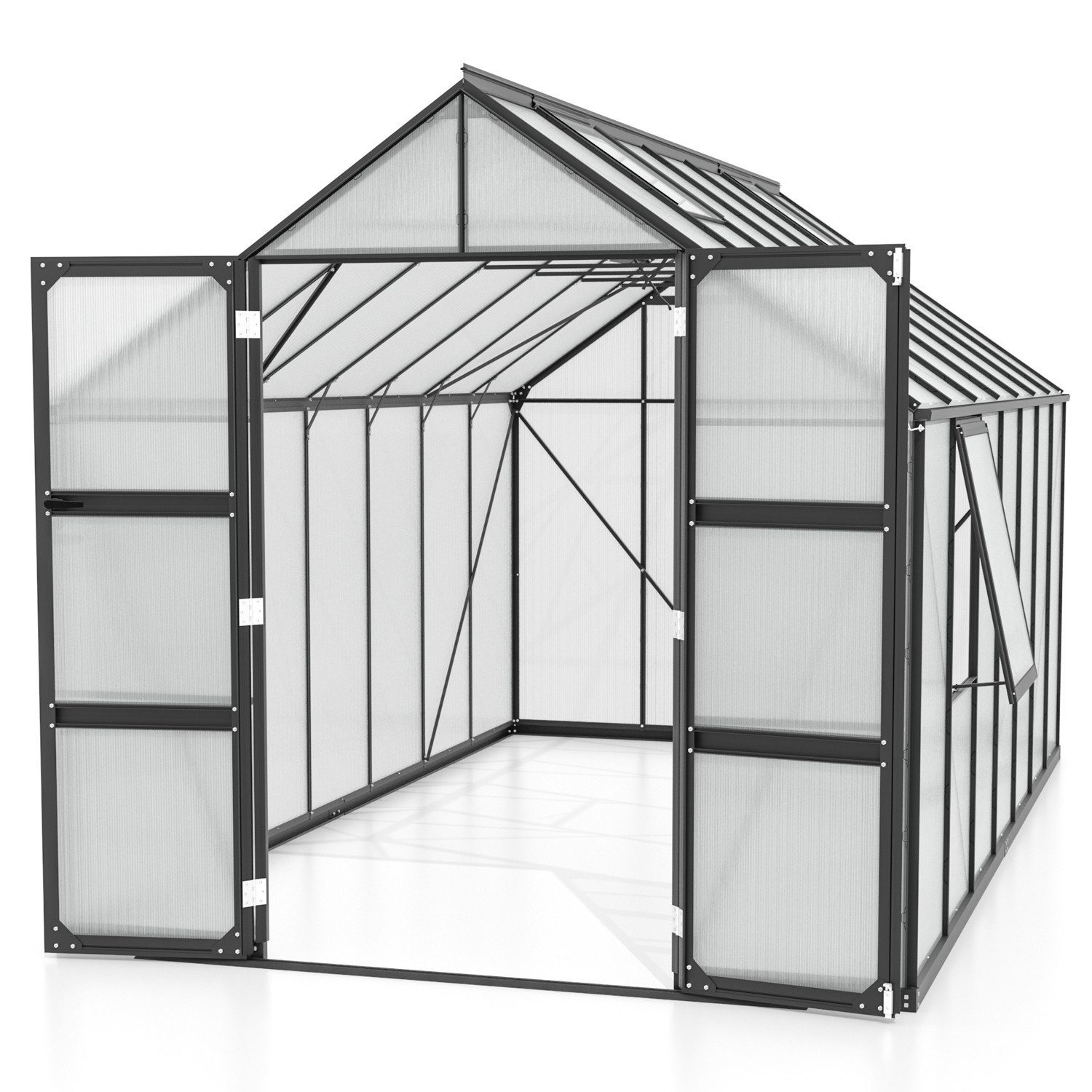Komfort geht vor! Das opulente Gewächshaus Olymp wird anspruchsvolle Gärtner durch seinen wohnlichen Komfort überzeugen! Hoher Komfort und optimierte Belüftung prägen daher das durchdachte Design. Für eine hervorragende Luftzirkulation, bei gleichzeitig wohnlichem Flair, ist das Gewächshaus Olymp mit besonders hohen Doppelflügeltüren und nicht nur Dach- sondern auch Seitenfenstern ausgestattet. So lässt sich auch ein heißen Sommertagen angenehm in Ihrem Gewächshaus arbeiten. Eine bodentiefe Türschwelle erleichtert Ihnen den Zugang mit Schubkarre, Erdsäcken oder schweren Pflanzkübeln. Egal, ob Sie eine Verglasung mit kristallklarem Sicherheitsglas (ESG) oder UV-stabilen Hohlkammerplatten (HKP) in 4 mm und 6 mm Stärke wählen: Die Scheiben erstrecken sich großflächig über die gesamte Höhe der Seitenfelder. Komplett mit dem 3 mm starken, bruchstabilen Sicherheitsglas ausgestattet, fügt sich ihr Olymp elegant und wertig in ihren Garten - und bietet den Pflanzen viel Licht und fördert so das Wachstum. Andererseits ist gerade an sonnigen Tagen eine Schattierhilfe gefragt, um den Brennglaseffekt zu vermeiden. Hohlkammerplatten brechen das Licht durch ihre leicht milchige Oberfläche. Sie haben außerdem sehr gute Isoliereigenschaften, was die Erntezeit verlängern kann oder empfindlichen Pflanzen beim Überwintern hilft. Die Polycarbonatplatten aus deutscher Herstellung sind aufgrund ihrer UV-Beschichtung haltbarer als herkömmliche Platten, und sind an den Längsseite geschlossen. So kann weniger Feuchtigkeit oder Schmutz eindringen und Ihr Gewächshaus sieht länger so schön aus wie am ersten Tag. Die Hohlkammerplatten sind dadurch außerdem stabiler, weil am Rand keine Hohlkammern offen stehen die leicht eingedrückt werden könnten. Ein abschließbares Stahlschloss und eine Aluminium-Türklinke erhöhen nicht nur den wohnlichen Charakter des Gewächshauses, sondern auch die Sicherheit für Ihre Pflanzen und Gartengeräte. Das Olymp ist in verschiedenen Größen mit Grundflächen von 6,7 bis 11,5 Quadratmetern und in verschiedenen Farben erhältlich. Vier Dachfenster, ein Seitenfenster, Regenrinne und der Stahlfundamentrahmen gehören zur Serienausstattung. breite Doppelflügeltür mit niedriger Türschwelle für komfortablen Zugang abschließbares Stahlschloss mit Aluminium-Türklinke belüftungsoptimiert Dank Kombination von Dach- und Seitenfenster großzügige Maße mit 1,60 m hohen Seiten und 2,54 m Gesamthöhe großflächige Scheiben oder Polycarbonatplatten für durchgängigen Lichteinfall Verglasungstechnik: Etablierte Federklammertechnik, erleichtert späteren Austausch einzelner Scheiben oder HKP stabile Befestigung der Hohlkammerplatten im Gewächshausrahmen durch längsseitig geschlossene Kanten inkl. Dachfenstern, Seitenfenster, Regenrinnen und Stahlfundamentrahmen inklusive der Streben zur Verankerung im Boden