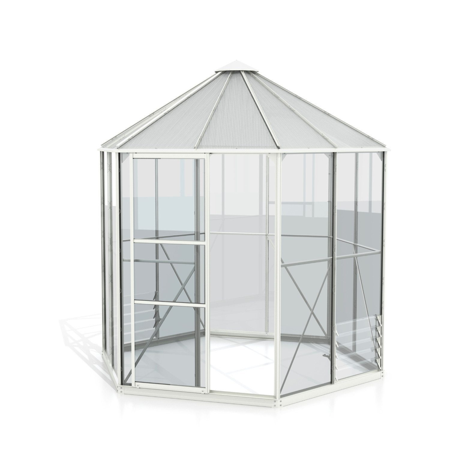 Der Gewächshaus-Pavillon! Wenn Sie sich nicht zwischen Gewächshaus und Pavillon entscheiden können, bietet der Gewächshaus-Pavillon Hera einen formschönen Kompromiss! Die Gewächshäuser haben eine leichtgängige, kugelgelagerte Doppelschiebetür und ein kittloses Verglasungssystem mit rostfreien Glasfederklammern. Das Modell ist für optimale Raumbelüftung mit Seitenfenstern ausgestattet. Die hier angebotene Ausführung ist mit 6 mm Hohlkammerplatten am Dach versehen und die Seitenfenster bestehen aus 3 mm Einscheibensicherheitsglas. Einscheibensicherheitsglas ist gehärtetes Blankglas. Es ist erheblich stabiler als normales Gartenblankglas. Ein wichtiger Vorteil: Es splittert nicht scharfkantig und vermindert so die Verletzungsgefahr. Dies ist vor allem da von Bedeutung, wo Kinder und Tiere im Haushalt leben. Außerdem ist es vollkommen durchsichtig und bietet einen ungehinderten Blick nach außen. Das mitgelieferte Stahlfundament ist breit genug, dass Sie das Gewächshaus direkt auf eine gerade Fläche aufstellen können. Wir empfehlen Ihnen ein Streifenfundament anzulegen, auf dem Sie den Aluminiumrahmen des Gewächshaus fest verankern können. Produktdetails: attraktives Design einfach zu montieren inkl. Stahlfundament inklusive Seitenfenstern Zwangsentlüftung im Dach Doppelschiebetür äußerst robust und langlebig Verglasung aus Glas und Hohlkammerplatten Eckverbindung mit Knotenblech Zubehörteile in gleicher Farbe erhältlich