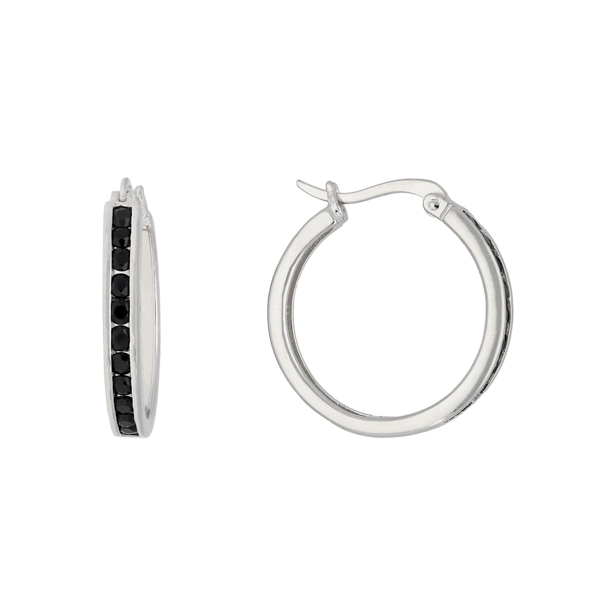 Dieses Creolenpaar aus rhodiniertem Sterlingsilber (925er-Silber) vereint Eleganz und edles Design! Die Ringe haben einen Durchmesser von 2,1 cm und sind mit einem Schiffchenbrisurverschluss versehen, der für einen sehr sicheren Halt sorgt. Jede Creole umschließt 12 aneinandergereihte schwarze Saphire (2 mm Durchmesser) mit rundem Schliff, die einen schönen Akzent setzen. Diese beiden Schmuckstücke passen zu schöner Abendkleidung aber auch zu vielen Alltagsoutfits.