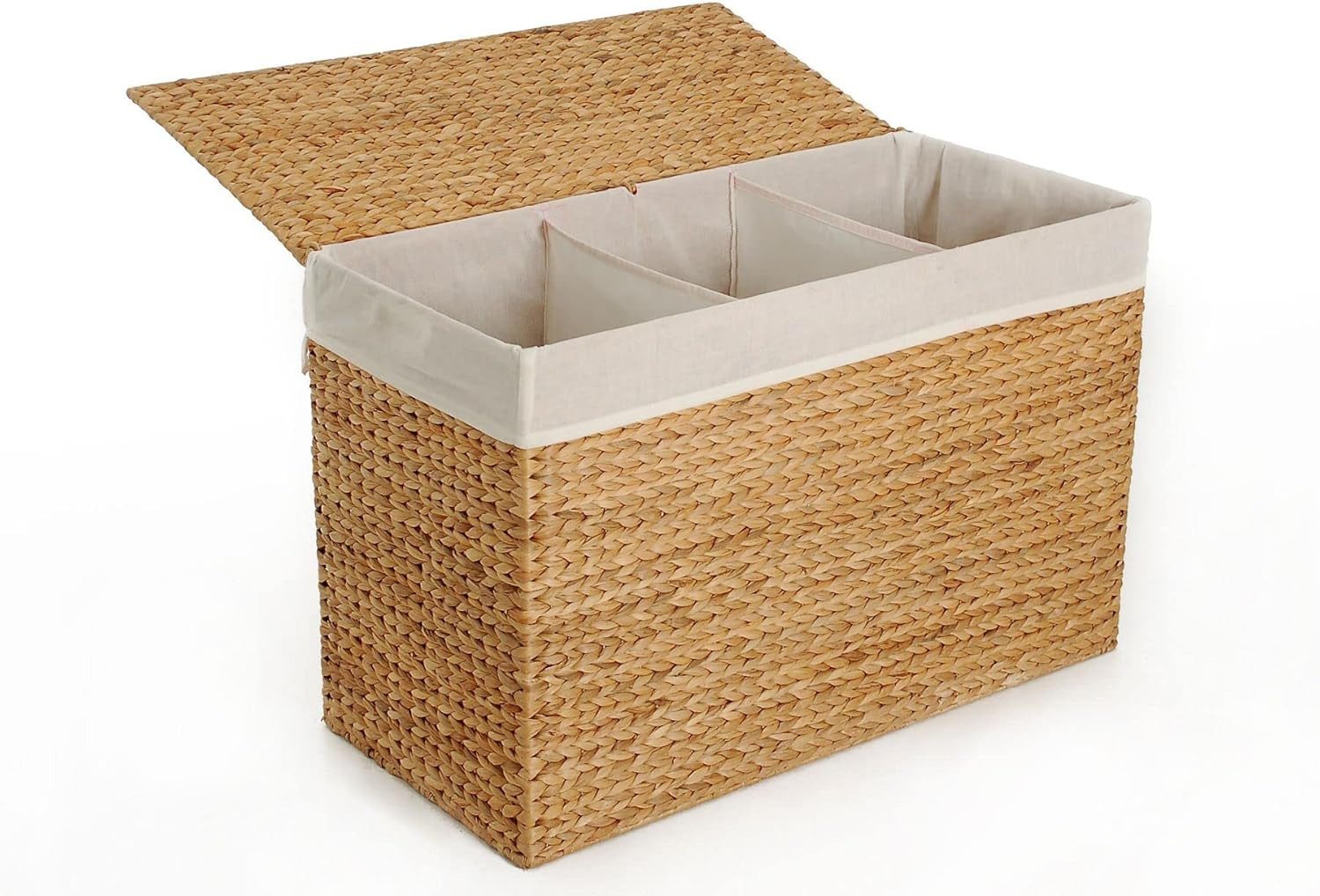 Das Flechtmaterial ist natürliche Wasserhyazinthe. Der Deckel ist aufklappbar und mit Kunststoffscharnieren befestigt.