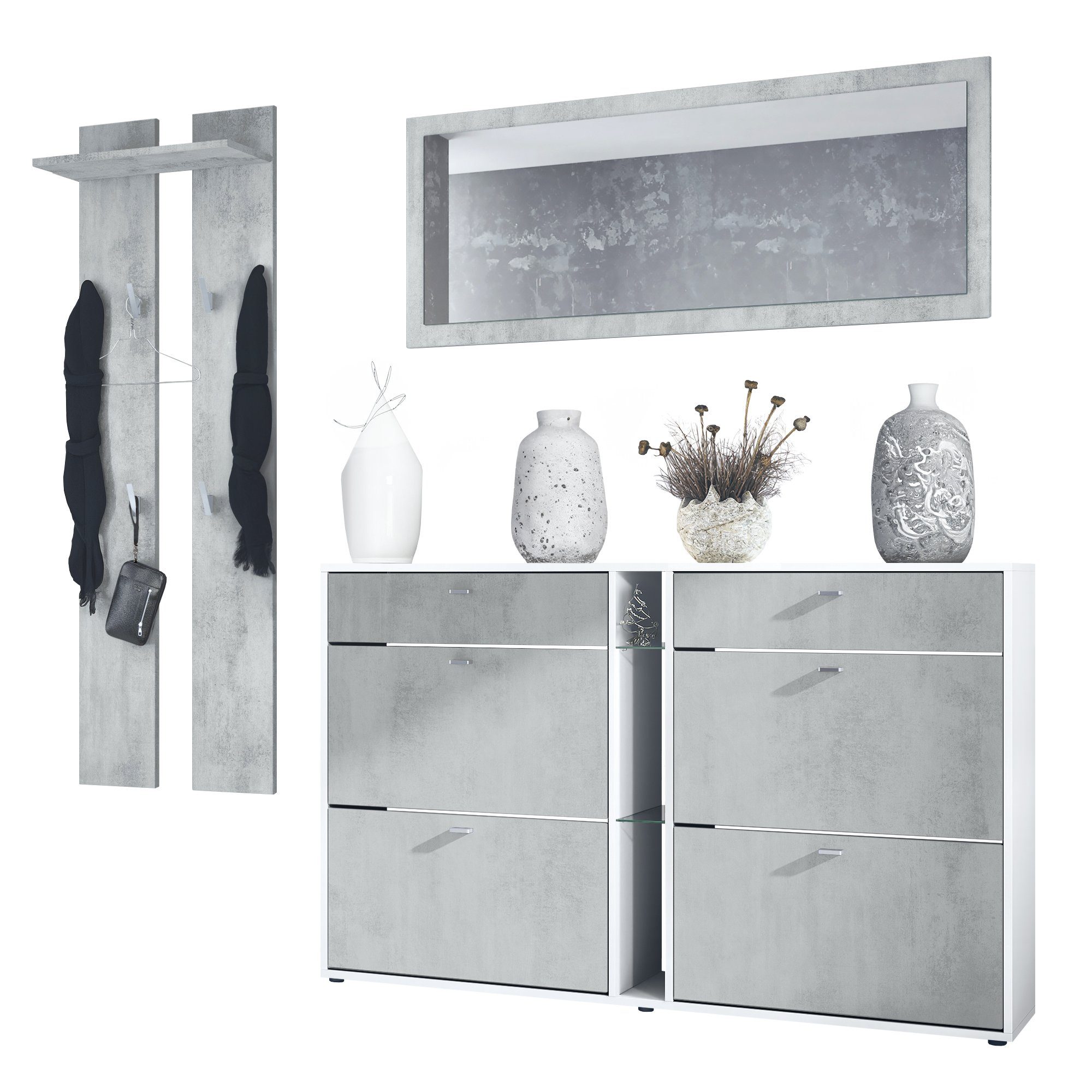 Der Schuhschrank präsentiert sich als moderner Aufbewahrungsort für bis zu 24 Paar Schuhe. Die silberfarbenen Griffe und die Glasablagen verleihen ihm eine zeitgemäße Note. Der elegante Wandspiegel mit abgerundeten Rahmenkanten setzt stilvolle Akzente und eignet sich ideal für Diele, Schlafzimmer oder Wohnzimmer.