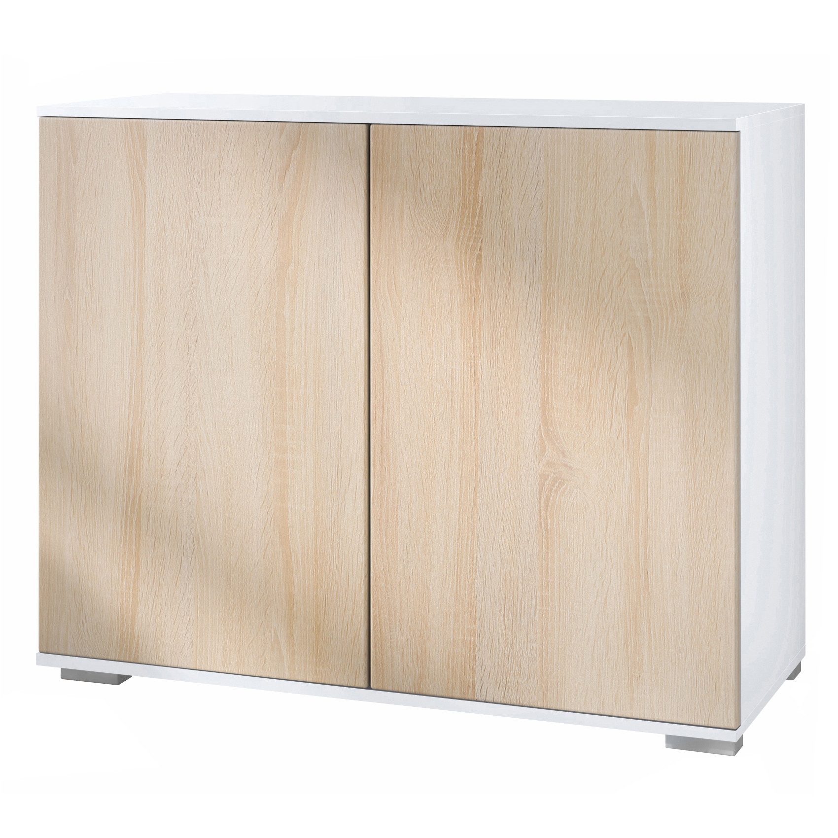 Ob als modernes Sideboard im Wohnzimmer, Kommodenschrank für‘s Schlafzimmer, Anrichte im Flur oder als Küchenschrank in der Küche - die geräumige Kommode Skadu V3 präsentiert sich als praktisches Möbelstück mit modernem Design, hergestellt in Deutschland. Der Beistellschrank ist mit zwei großen Türen ausgerüstet. Hinter den Türen befinden sich jeweils zwei geräumige Fächer mit verstellbaren Einlegeboden. Die Türen sind mit unserem Push-to-Open-System ausgestattet. Eine Rückwand in Holzoptik aus Hartfaserplatten ist im Lieferumfang enthalten.