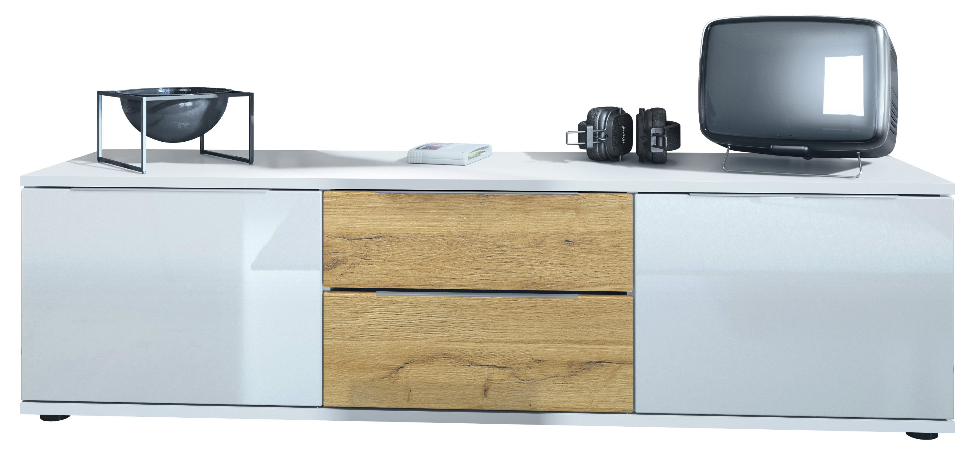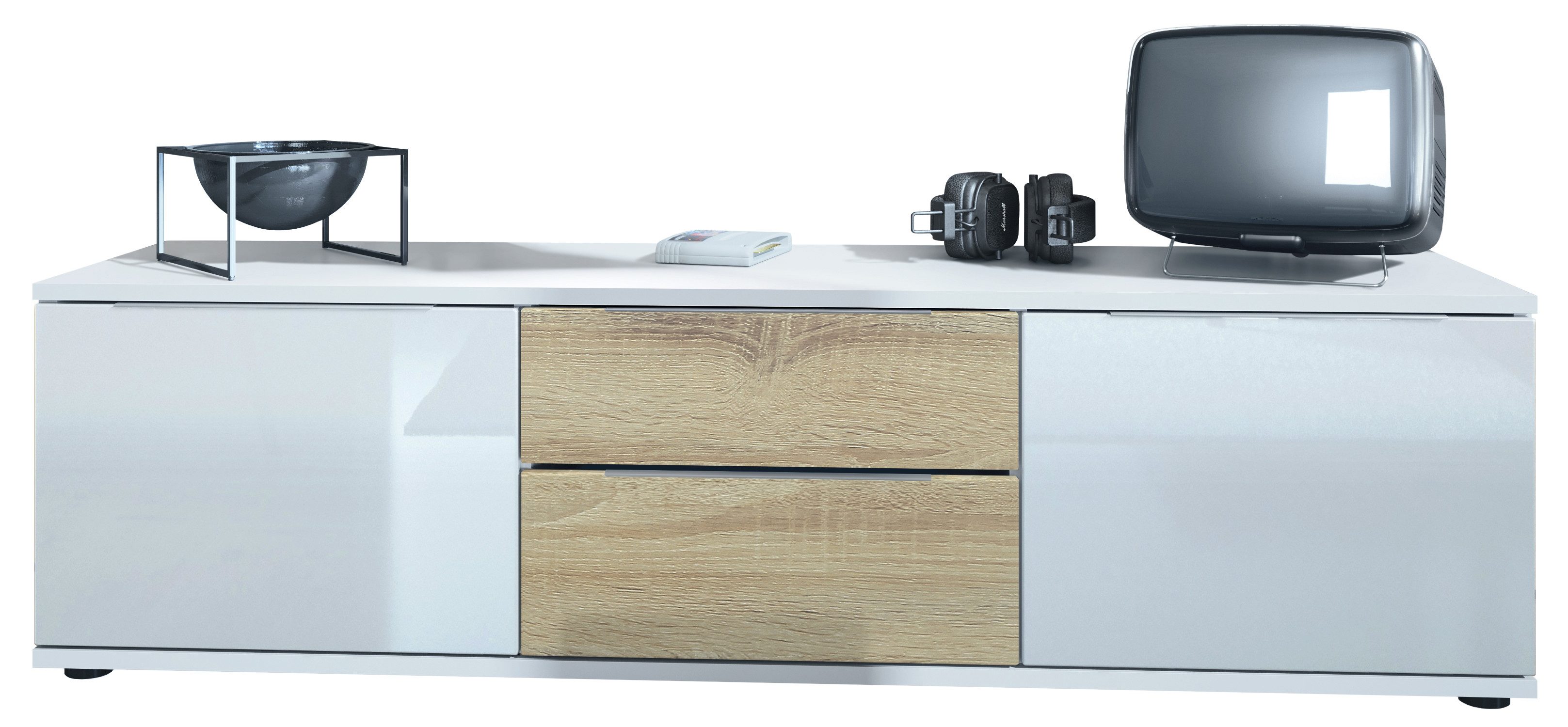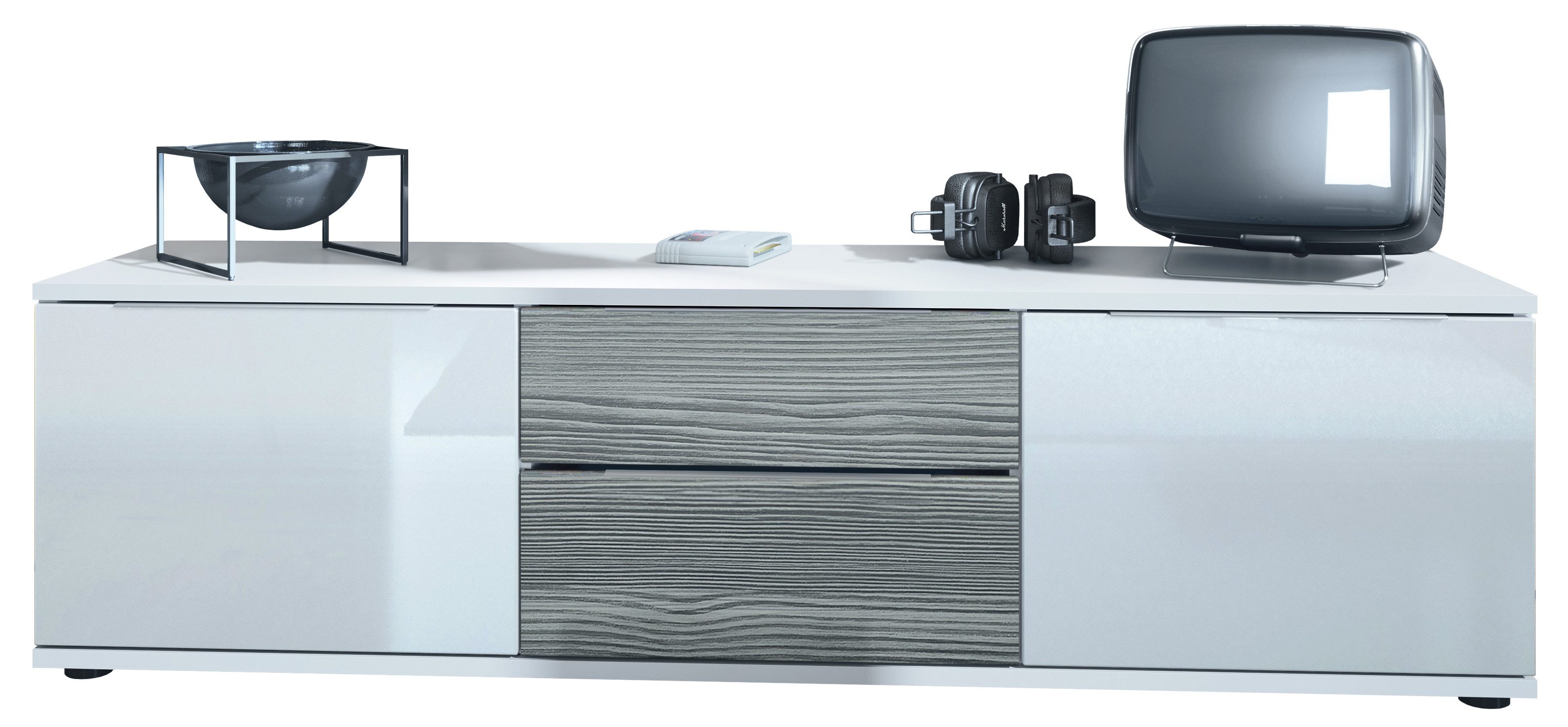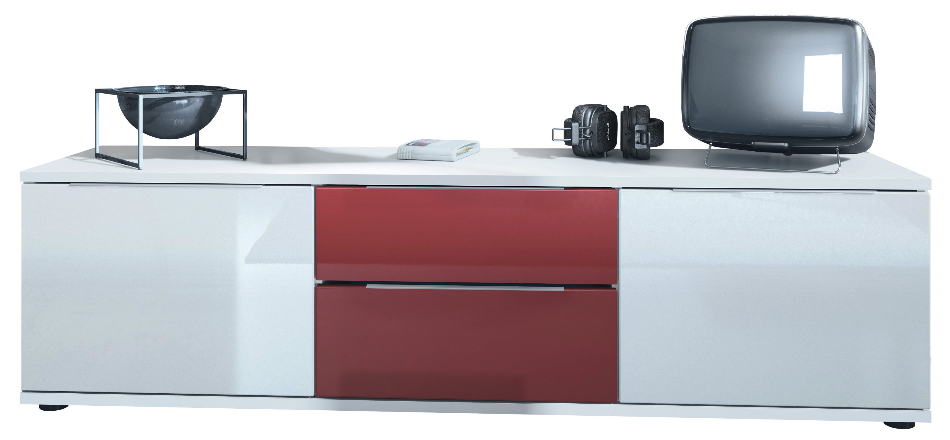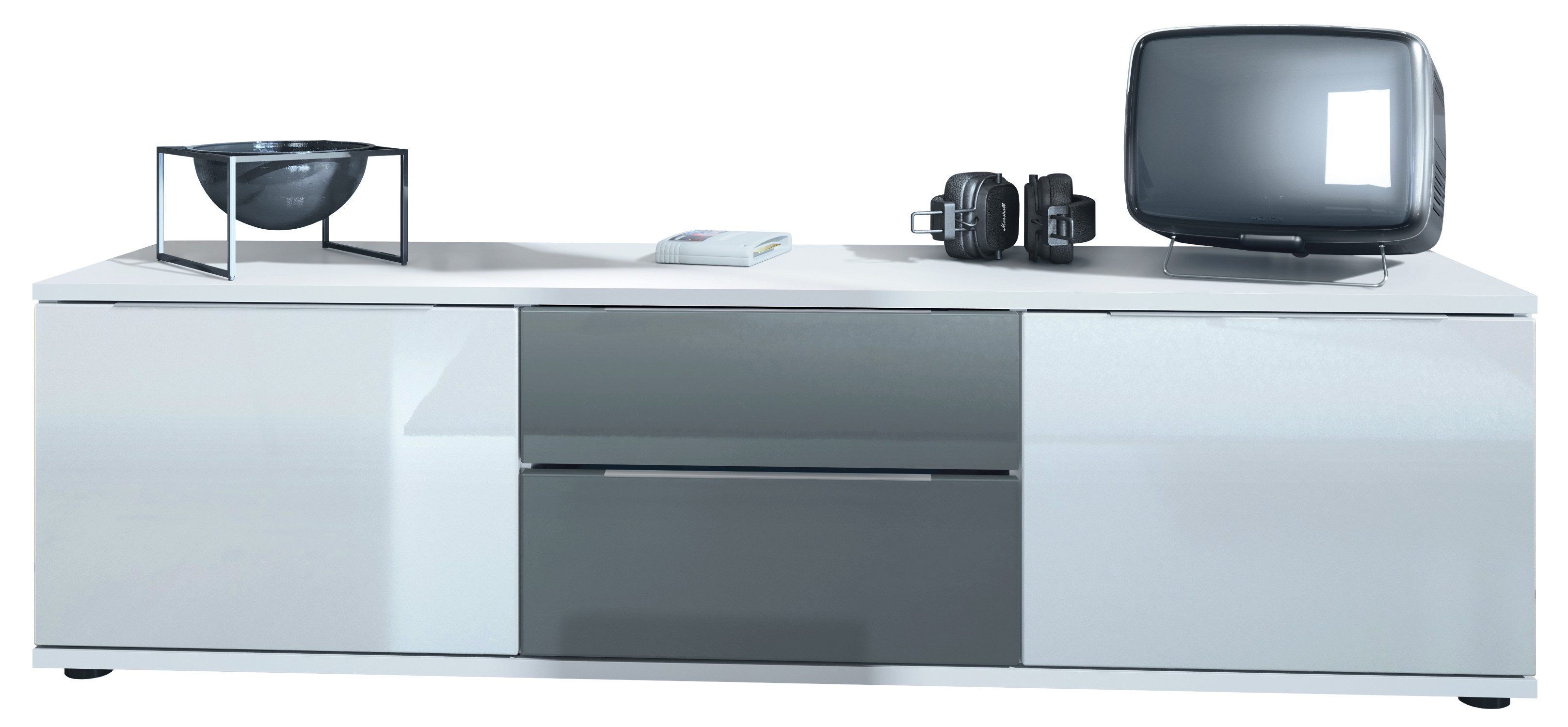Die Türen des Möbelstücks sind aus glatten, weiß hochglänzenden MDF-Fronten gefertigt, während die Schubladen in einer Vielzahl von Farben erhältlich sind. Gestalten Sie Ihr Zuhause nach Ihren Wünschen und integrieren Sie den Fernsehtisch harmonisch in jeden Raum. Der Korpus des TV-Boards besteht aus mattweißer Spanplatte.