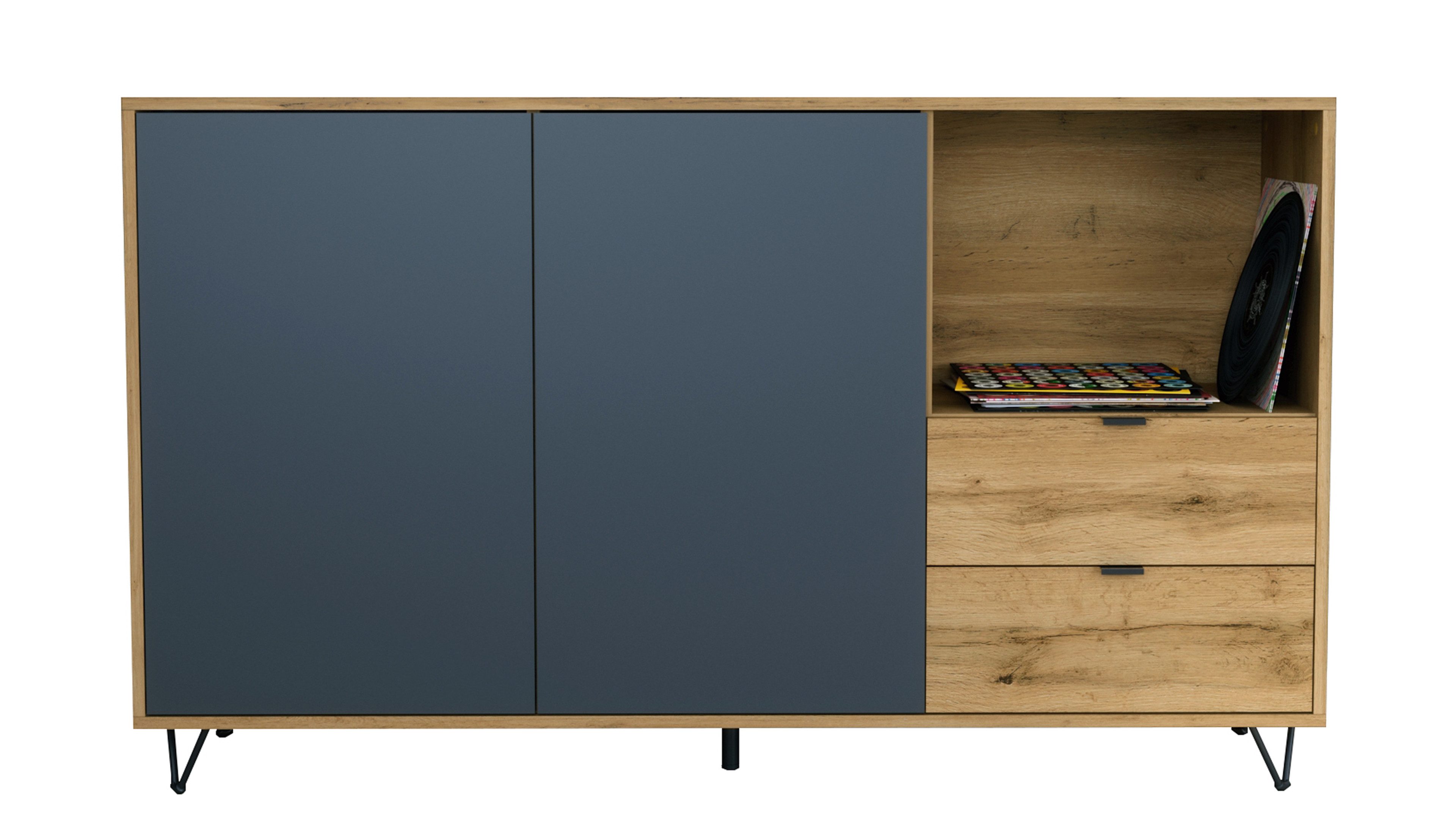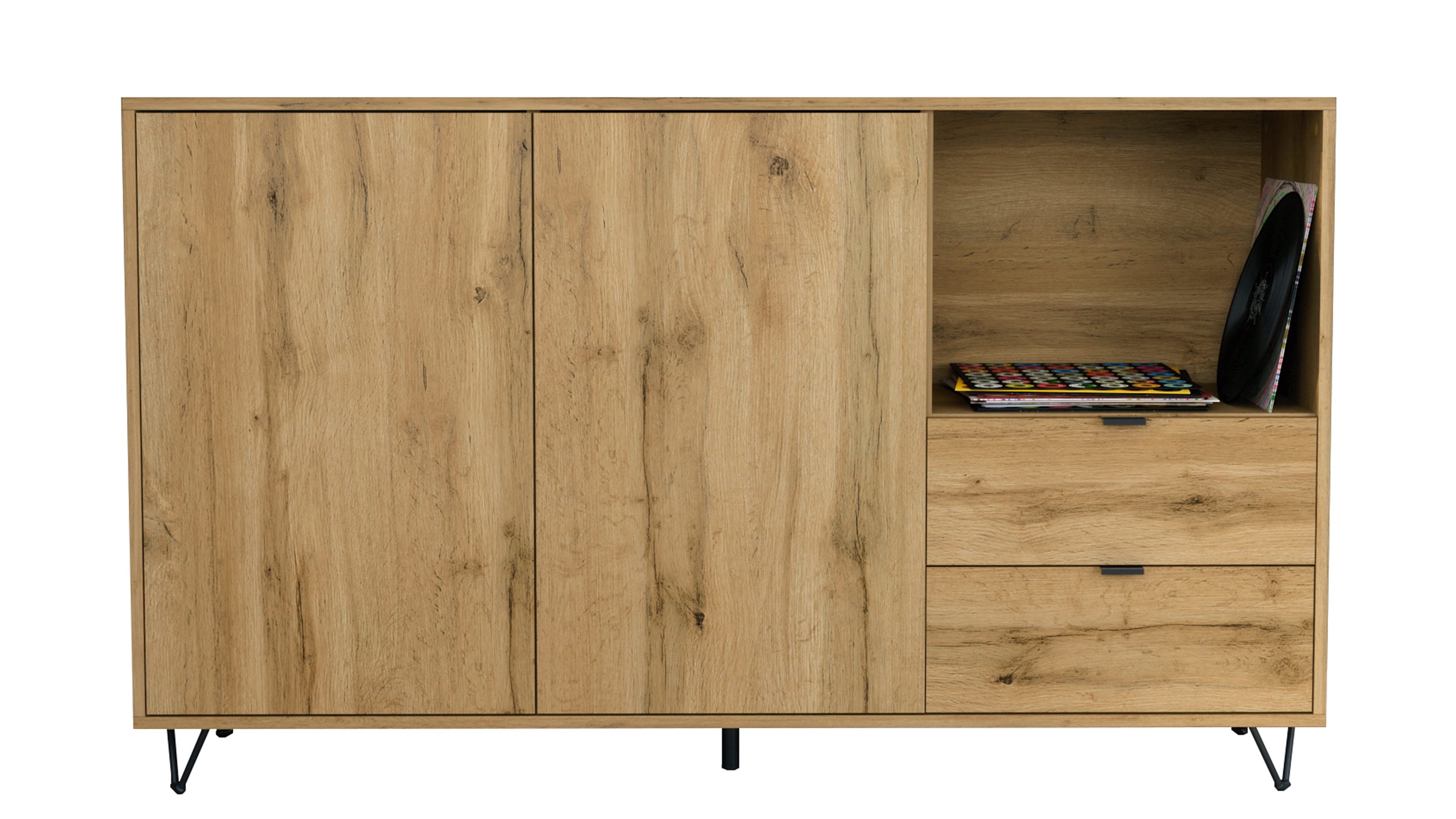 Das Marino Sideboard vereint modernes Design mit cleverem Stauraum. Der Korpus in Eiche Evoke verleiht dem Möbelstück eine zeitlose, elegante Ausstrahlung. Schwarze Füße sorgen für Stabilität und setzen elegante Akzente. Die Frontfarbe ist individuell wählbar – ideal für Wohnzimmer, Schlafzimmer, Esszimmer oder Flur.