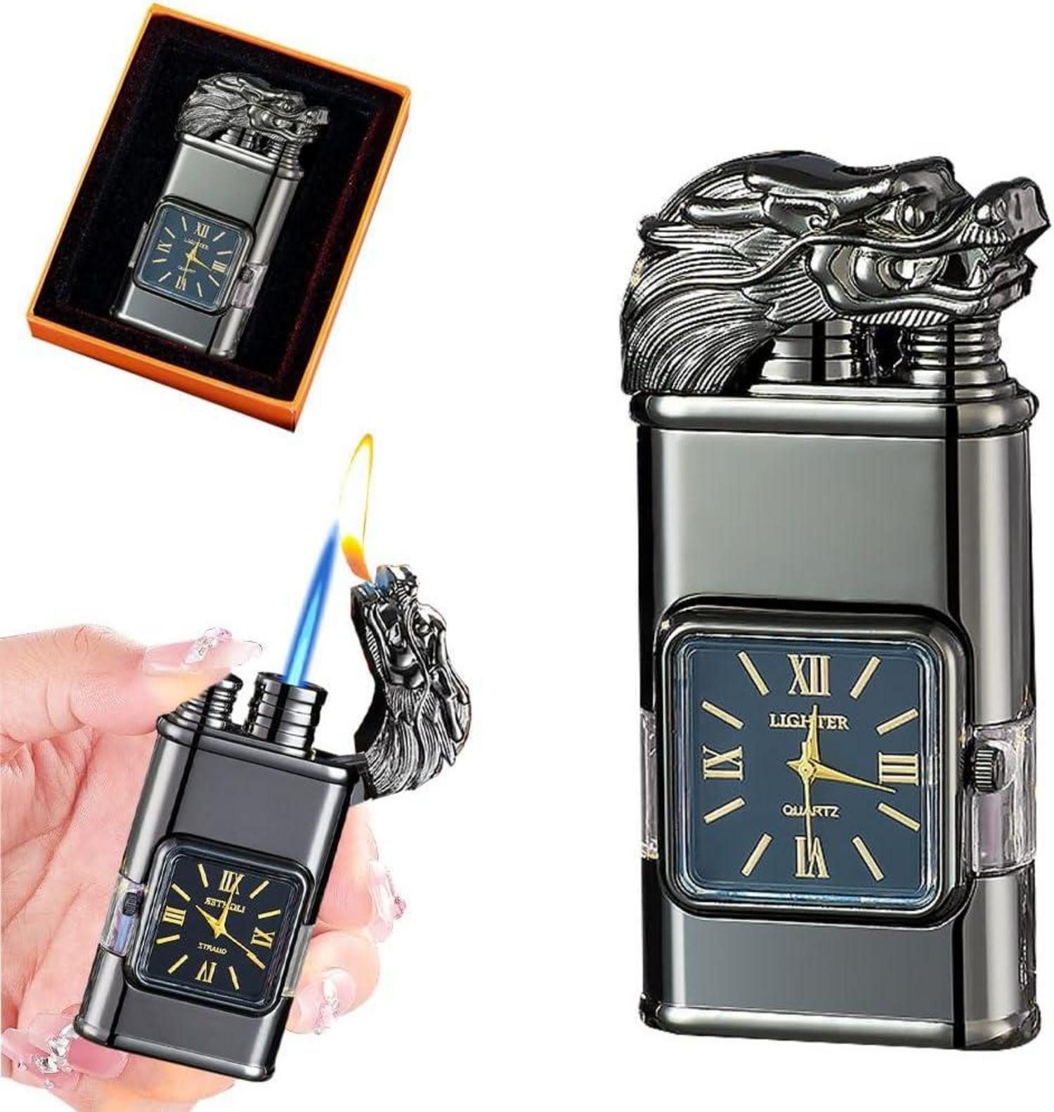 ????Einzigartiges Design Das feuerzeug kombiniert die Funktionen einer Uhr und eines Feuerzeugs mit einem einzigartigen Erscheinungsbild, wurde die traditionelle Zündmethode geändert. Dieses Feuerzeug kann sowohl das Feuer anzünden als auch die Uhr beobachten, was Ihnen ein hervorragendes Erlebnis bietet.