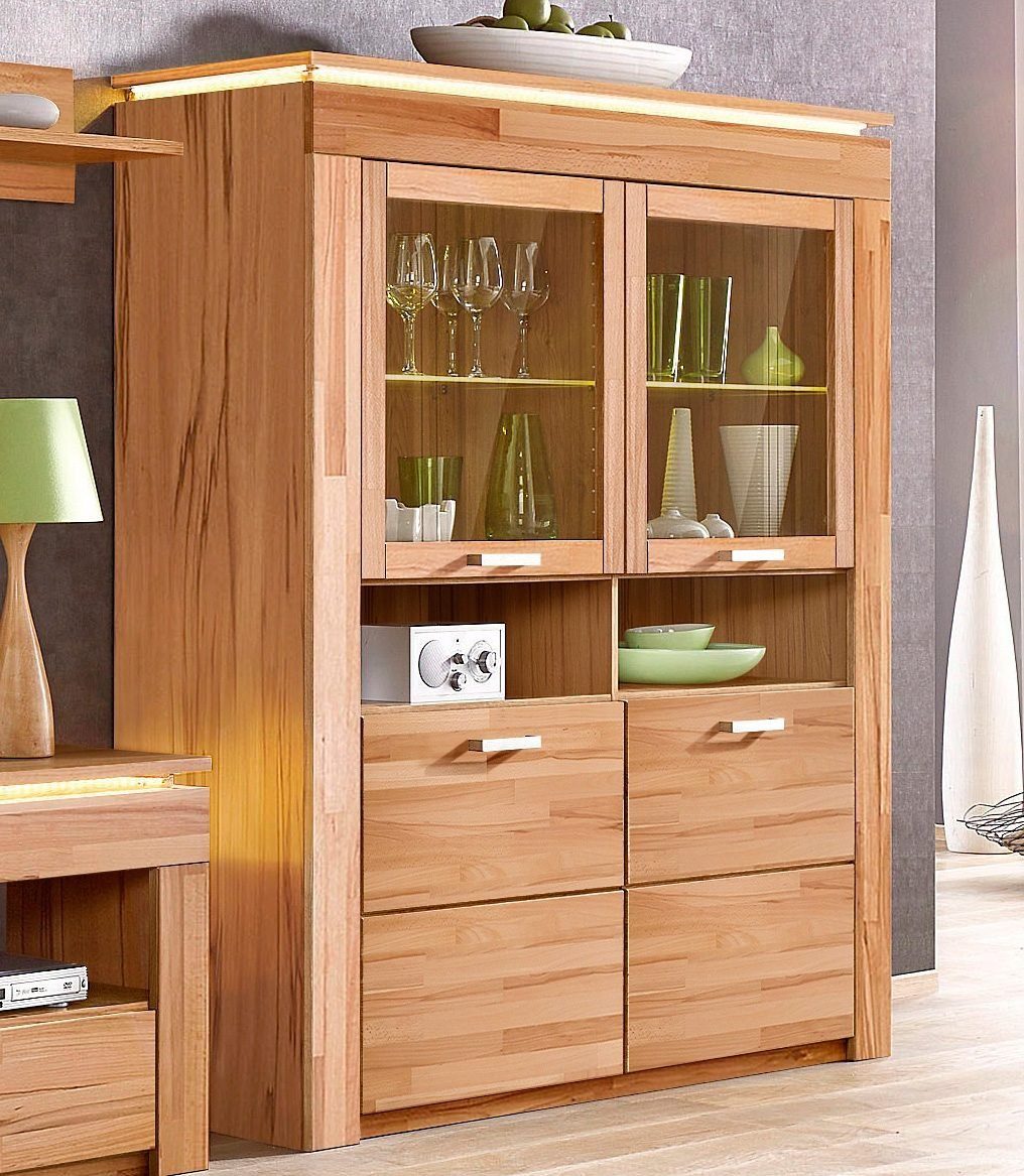 Wissenswertes | Vitrine mit einer Front aus Massivholz und einem Korpus aus Kunststoff Nachbildung. Oben zwei Glasrahmentüren mit je einem Glaseinlegeböden, darunter ein offenes Fach und zwei Holztür mit je einem Einlegeboden. Oberplatte mit Schattenfugen für LED-Stripes. In folgenden Farben erhältlich:
