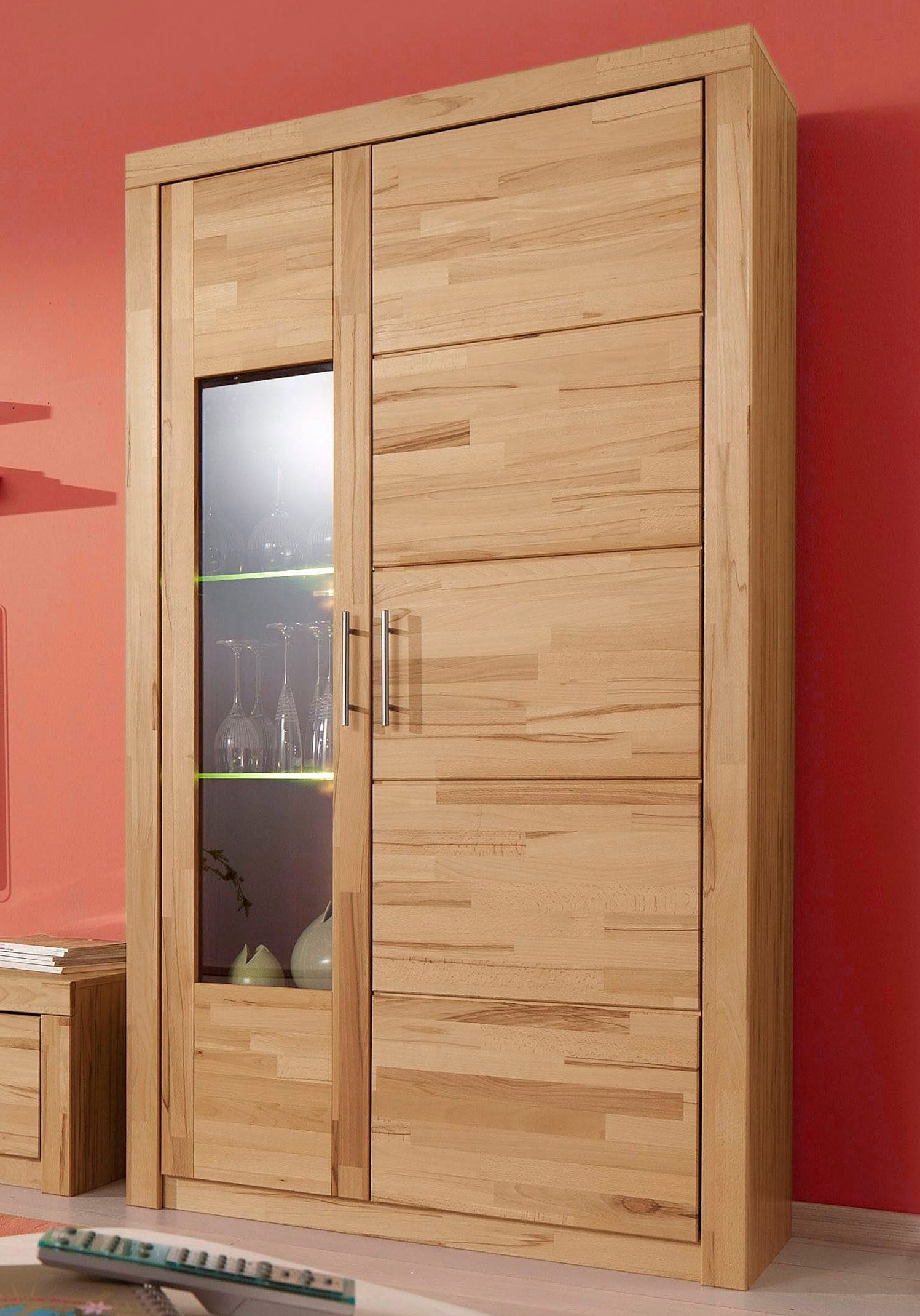 Wissenswertes | Wohnmöbel-Programm von hoher Qualität, in meisterhafter Verarbeitung und aktueller Rahmenoptik. Korpus kernbuche- oder wildeichefarben. Fronten Kernbuche oder Wildeiche massiv, geölt. Ganzmetallscharniere. Hochwertige Metallgriffe. Schubladen auf Metallführung. 2-türig. 1 Holztür und 1 Tür mit Glaseinsatz, dahinter oben und unten 1 fester Boden. In der Mitte 2 Glasböden. Der Türanschlag ist wechselbar montierbar. Maße (B/T/H): 105/42/191. Всеs ca.-Maße. Beleuchtung bitte extra bestellen: Wir empfehlen für diese Vitrine die LED-Glaskantenbeleuchtung im 2er-Set in warmweiß (Artikelnummer: 852380). |