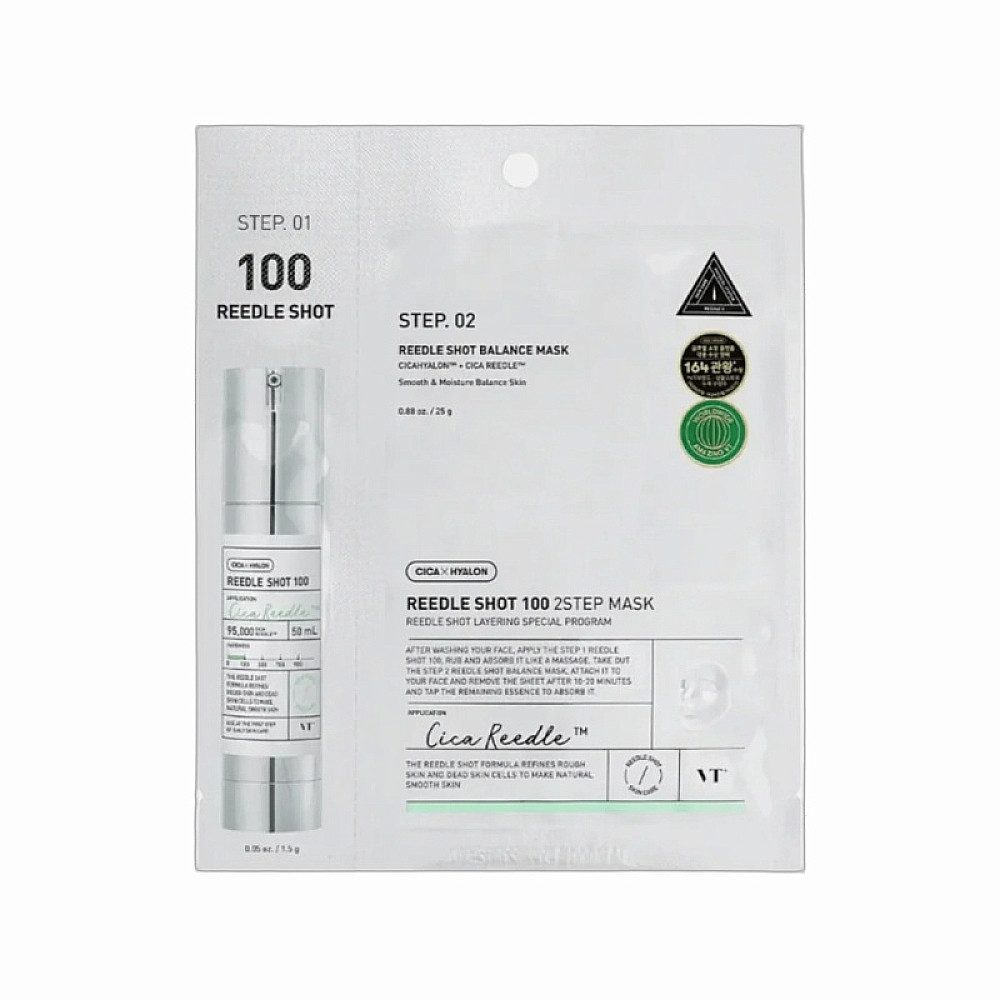 Die VT Cosmetics Reedle Shot 100 2-Step Mask ist eine zweistufige Gesichtsmaske, die entwickelt wurde, um die Haut zu revitalisieren und die Aufnahme nachfolgender Pflegestoffe zu optimieren. Sie kombiniert eine vorbereitende Essenz mit einer beruhigenden Tuchmaske für eine umfassende Hautpflege.