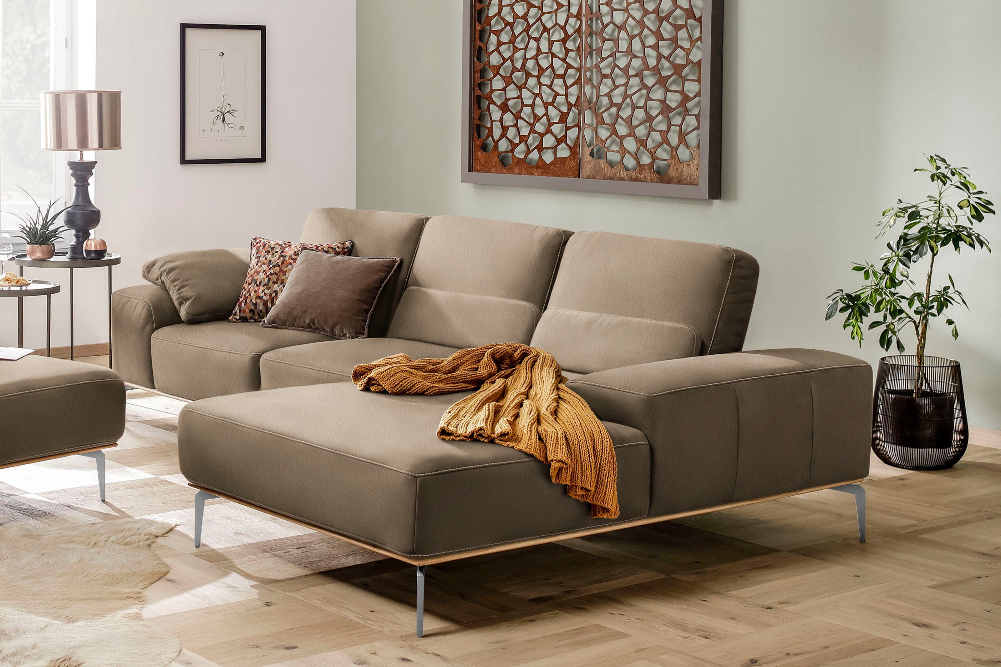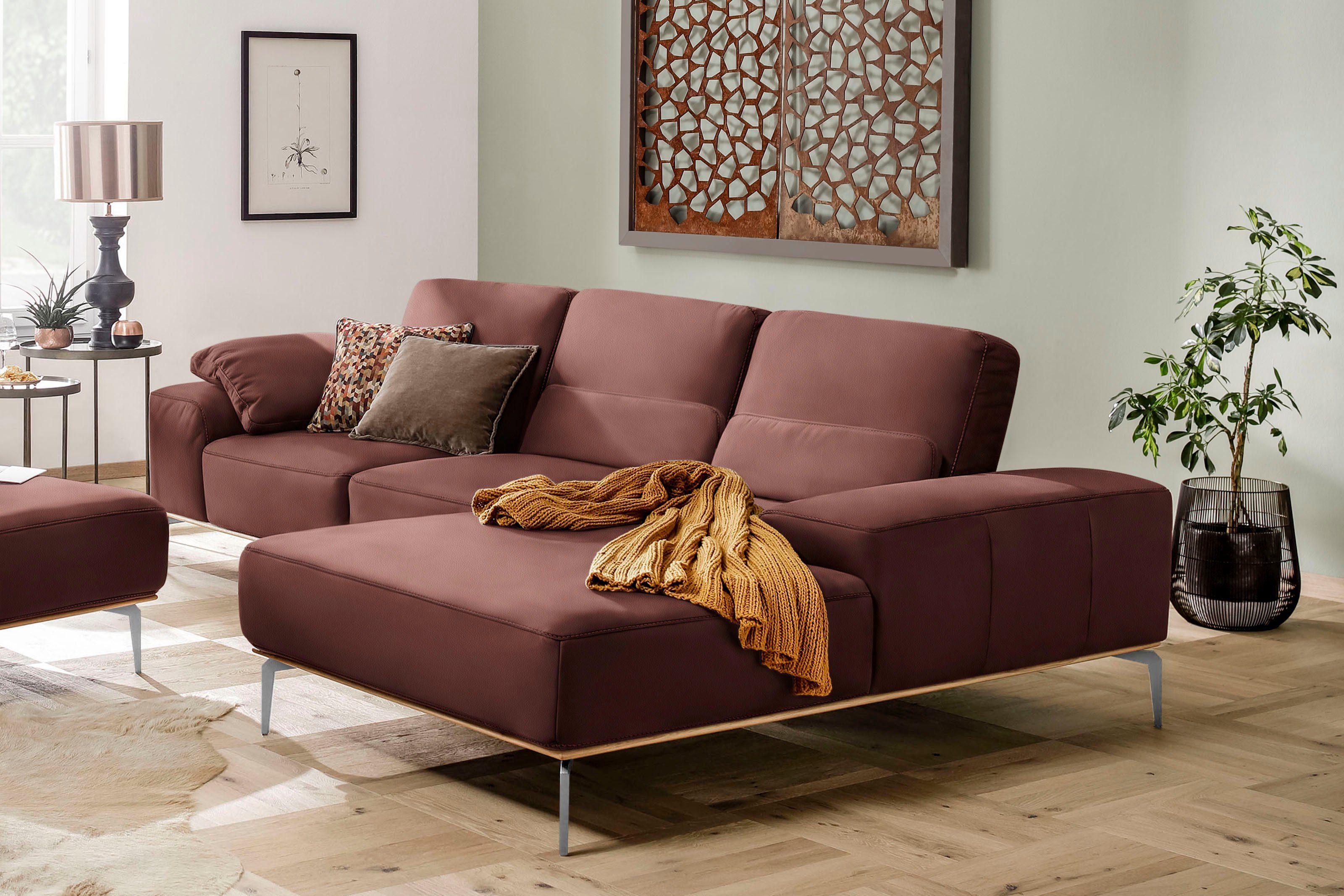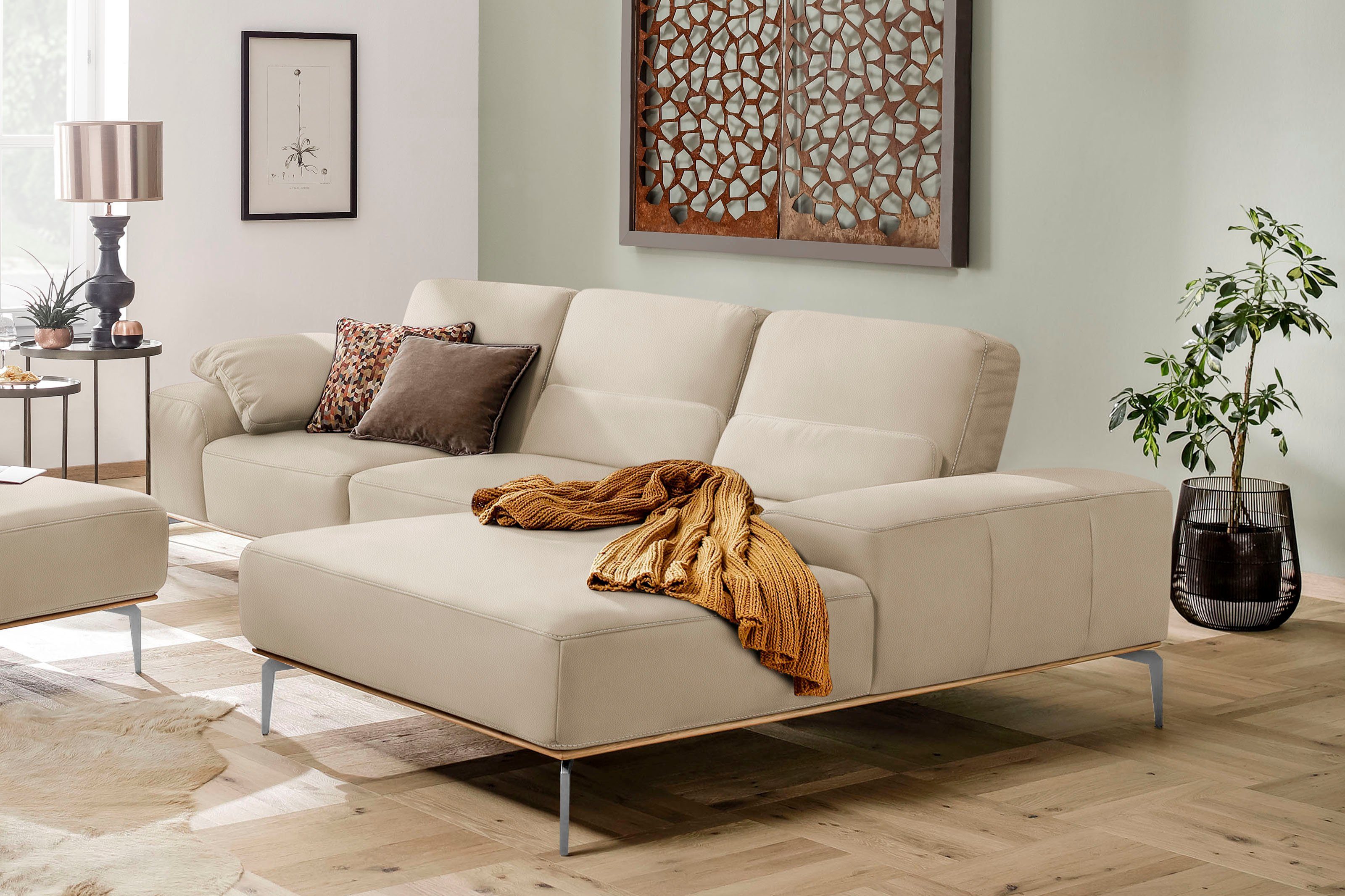 Wissenswertes | Der Sockel in Echtholz Eiche integriert sich wunderbar ins Design Ihres Möbelstücks Flexible Sitztiefe: Bei den Sofas kann der gesamte Rücken pro Sitz um einige Zentimeter nach hinten versetzt werden, um eine Vergrößerung der Sitztiefe zu erzielen. Die Gesamttiefe ändert sich. Polsteraufbau: