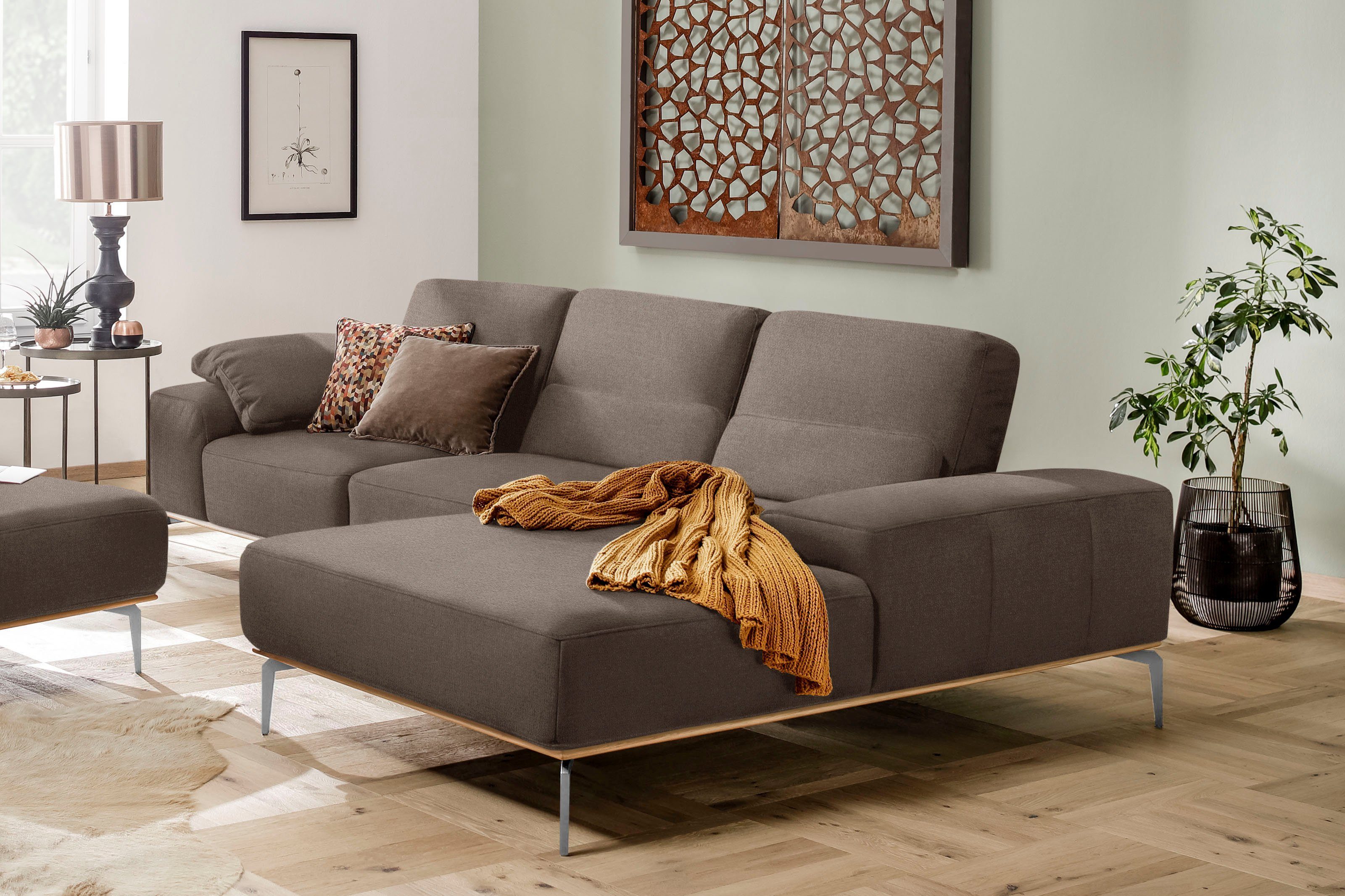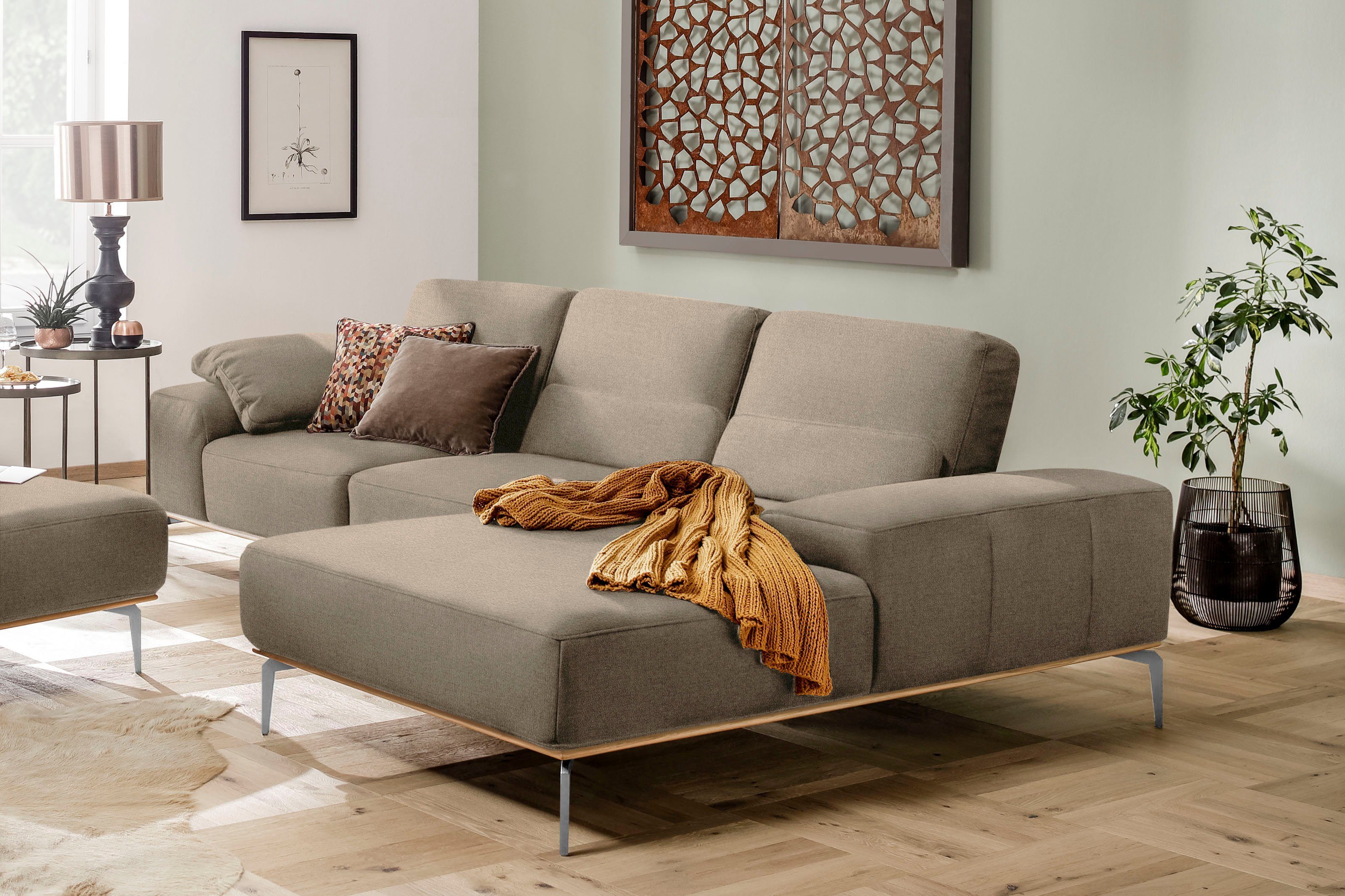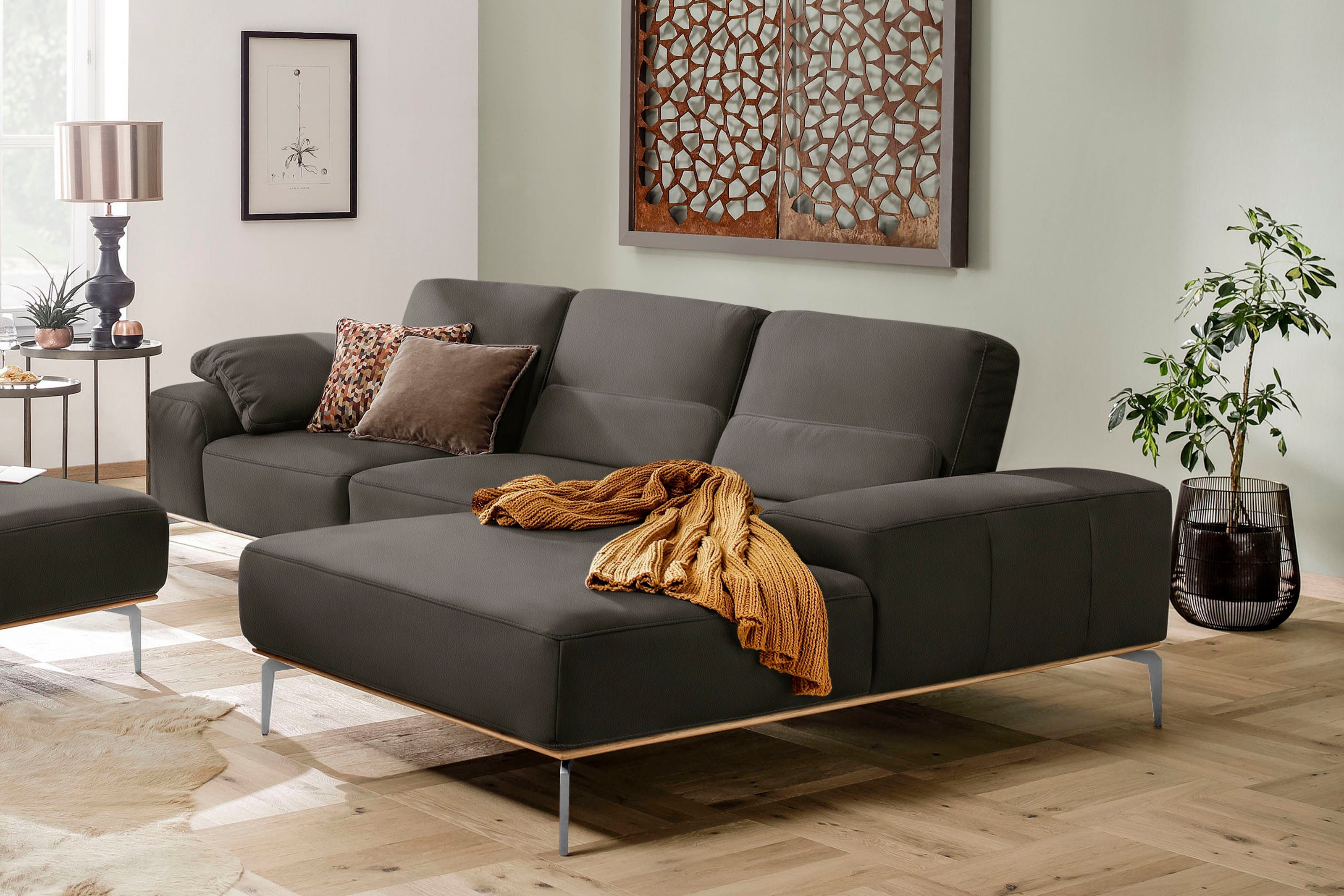 Wissenswertes | Der Sockel in Echtholz Eiche integriert sich wunderbar ins Design Ihres Möbelstücks Flexible Sitztiefe: Bei den Sofas kann der gesamte Rücken pro Sitz um einige Zentimeter nach hinten versetzt werden, um eine Vergrößerung der Sitztiefe zu erzielen. Die Gesamttiefe ändert sich. Polsteraufbau: