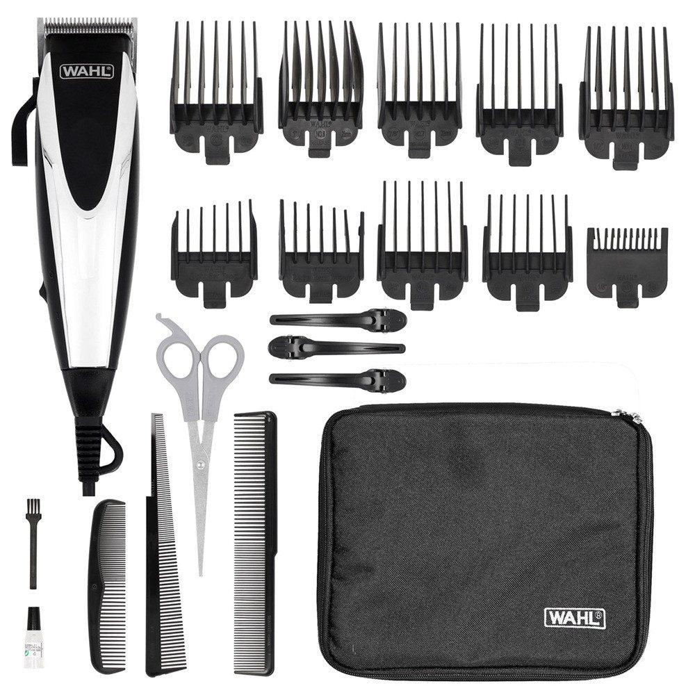 Lieferumfang | Aufbewahrungstasche Aufsteckkämme für rechtes und linkes Ohr Aufsätze Bedienungsanleitung Haarclips Klingenöl Messerschutz Reinigungsbürste Schere |