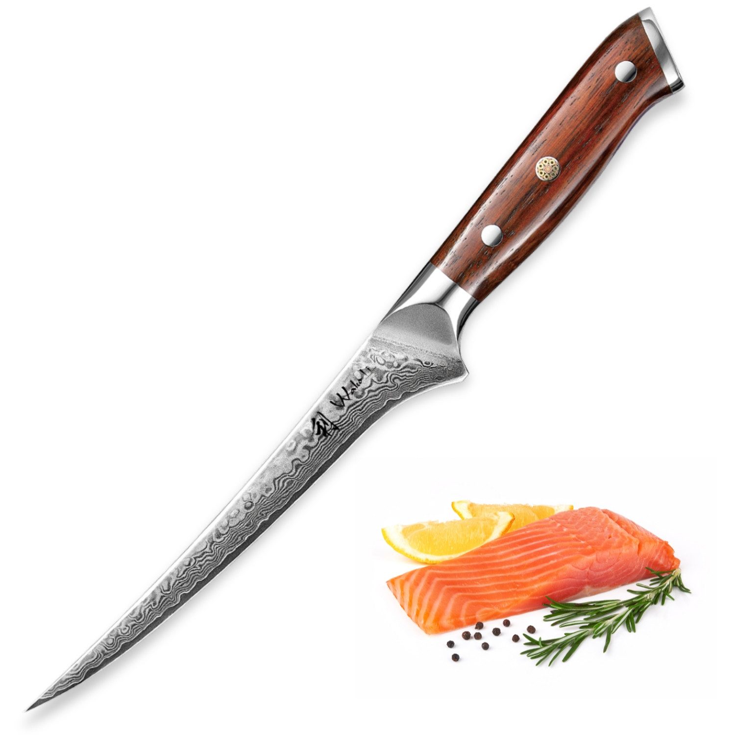 Die Griffe der Rosaki Serie sind aus edlem Rosenholz gefertigt, auch bekannt als Palisander. Dieses hochwertige Material bietet nicht nur eine angenehme Haptik, sondern sorgt auch für optimale Balance und Kontrolle bei jedem Schnitt. Der kunstvolle Mosaikpin im Griff verleiht jedem Messer eine besondere Eleganz und unterstreicht die Exklusivität der Serie.