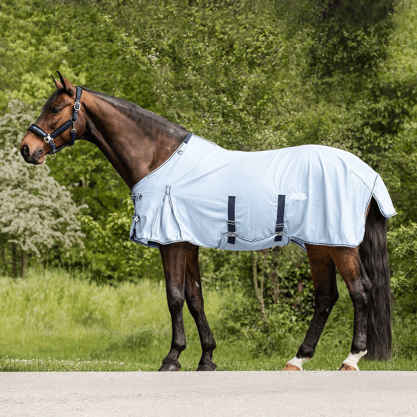 Hochwertige Fliegendecke aus feinmaschigem Gewebe mit Bauchgurt und Schweiflatz zum Schutz vor lästigen Insekten. Doppelter Frontverschluss, Gehfalte, Schweifkordel und Beinschnüre sorgen für einen guten Sitz.