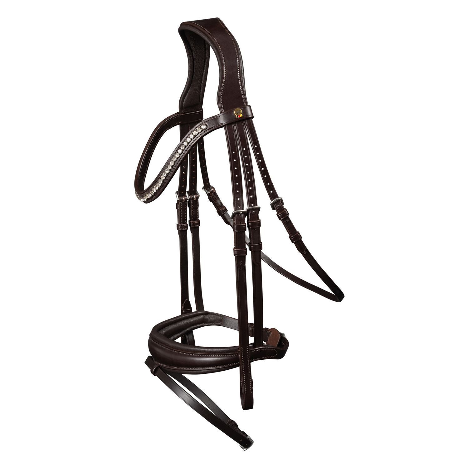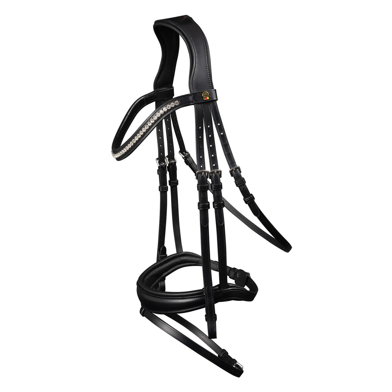 Der englisch kombinierte Waldhausen Trensenzaum aus der hochwertigen S-Line Serie bietet mit seinem weichen Genickstück mit zusätzlicher Ohrenfreiheit einen angenehmen Komfort. Das geschwungene Stirnband fällt mit seiner edlen Strasskette sofort auf.