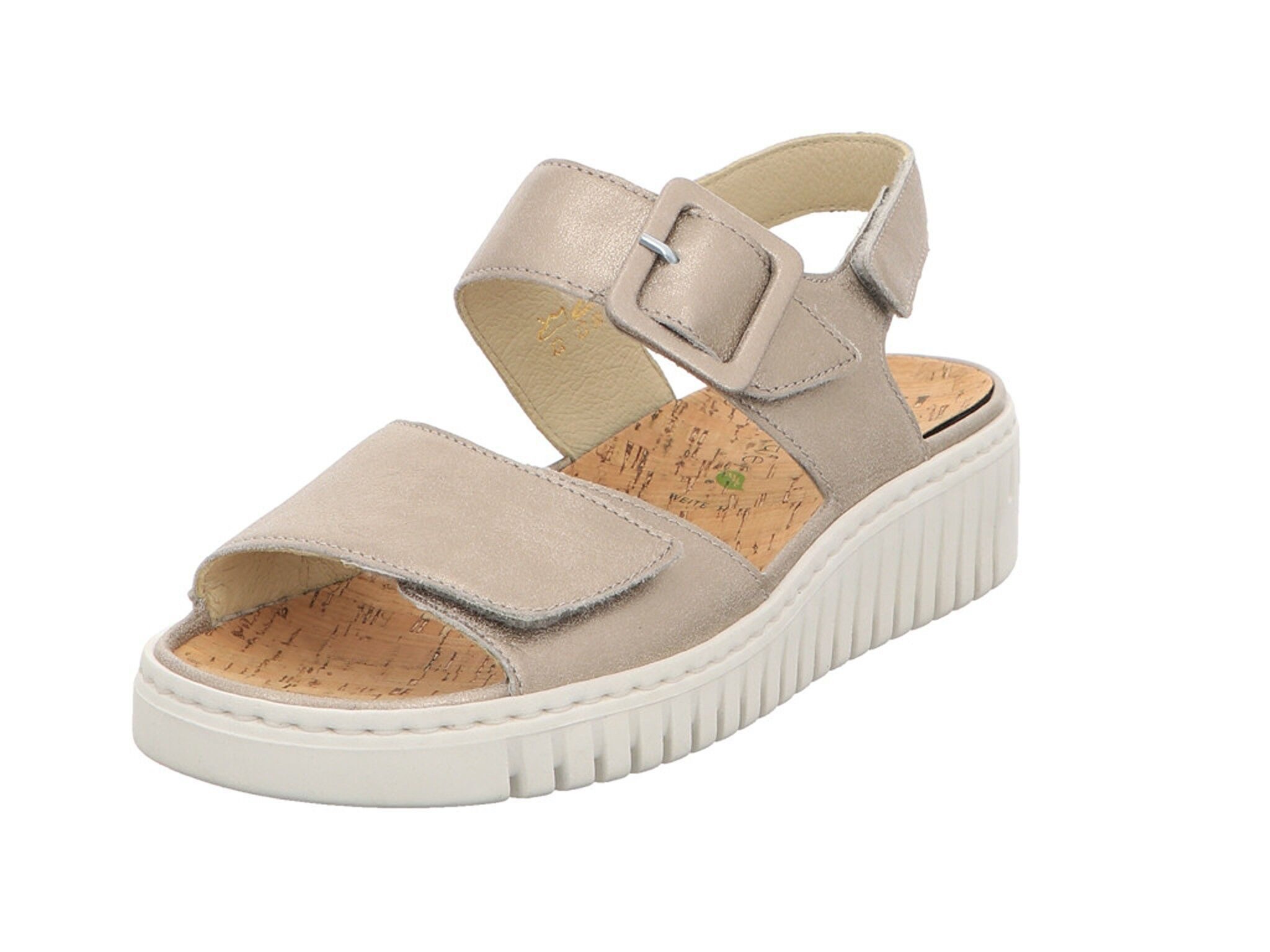 Das Obermaterial aus Nappaleder ist geschmeidig und weich. Die profilierte Synthetik-Sohle der Plateausandalen bietet dir mehr Rutschfestigkeit auf unebenem Untergrund. Dank der ca. 2 cm hohen Plateausohle erhältst du nicht nur einen modischen Look, sondern auch zusätzlichen Komfort bei jedem Schritt. Die Innensohle aus Kork ist herausnehmbar, was eine individuelle Anpassung und einfache Reinigung ermöglicht. Dank dem Plateauabsatz wird zusätzliche Höhe geschaffen, ohne den Komfort zu beeinträchtigen. Diese Plateausandalen in Weite H sind für kräftigere, volle Füße geeignet.