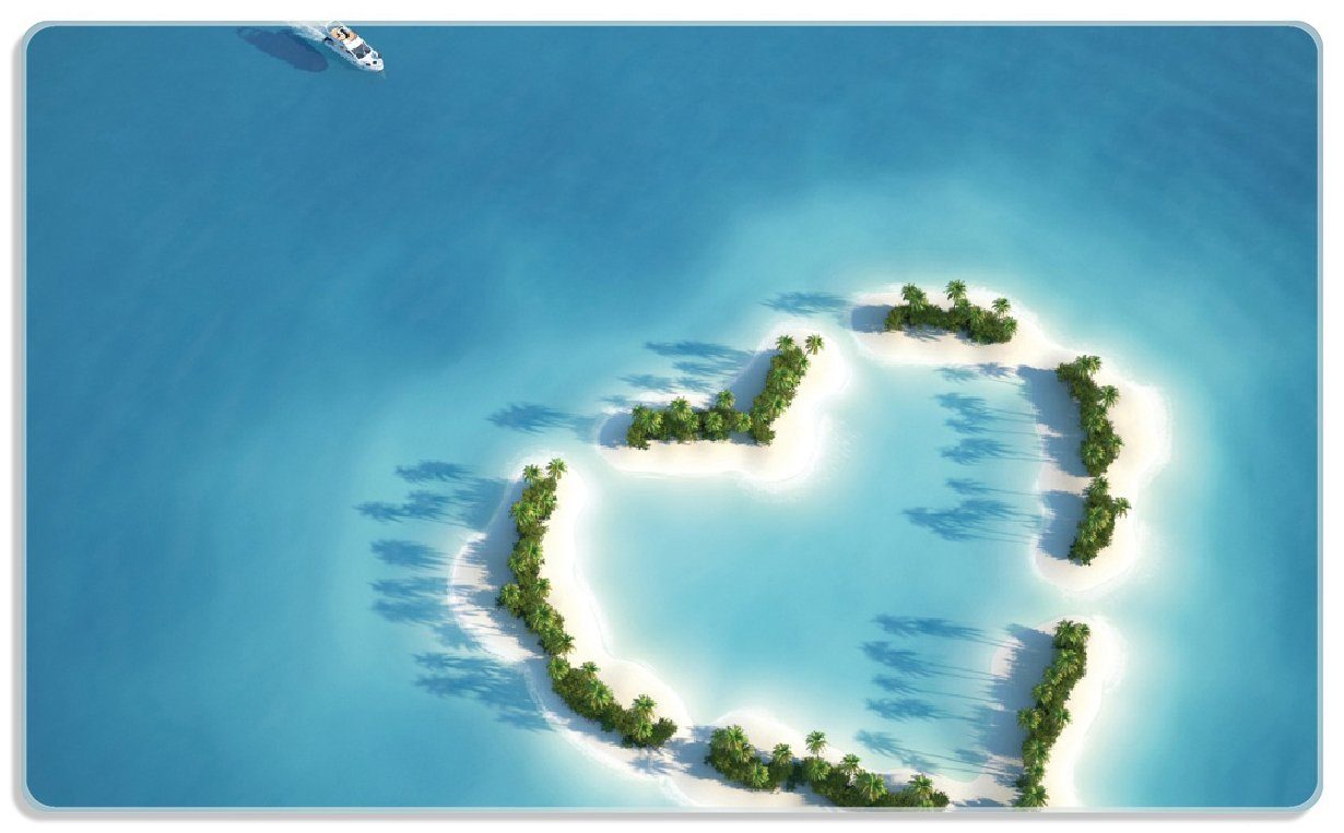 Eine kleine Insel in der Form eines Herzens umgeben von nichts außer aquamarinblauem Wasser. Bei purem Sonnenschein ist ein kleines Boot auf dem Weg zur Insel auf der sich grüne Palmen befinden und man entspannt am weißen Sandstrand spazieren kann.