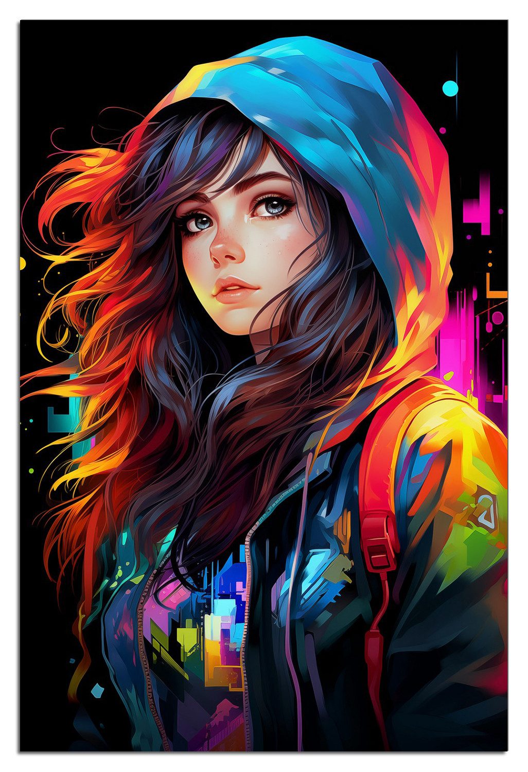 Ein junges Mädchen in einem farbenfrohen Hoodie zieht alle Blicke auf sich. Ihre tiefen Augen und das wilde, von Neonlicht durchdrungene Haar, verkörpern den Geist einer futuristischen Cyberpunk-Welt. Die Kombination aus lebendigen Farben und einem modernen Look verleiht dem Bild eine dynamische und energiegeladene Ausstrahlung.