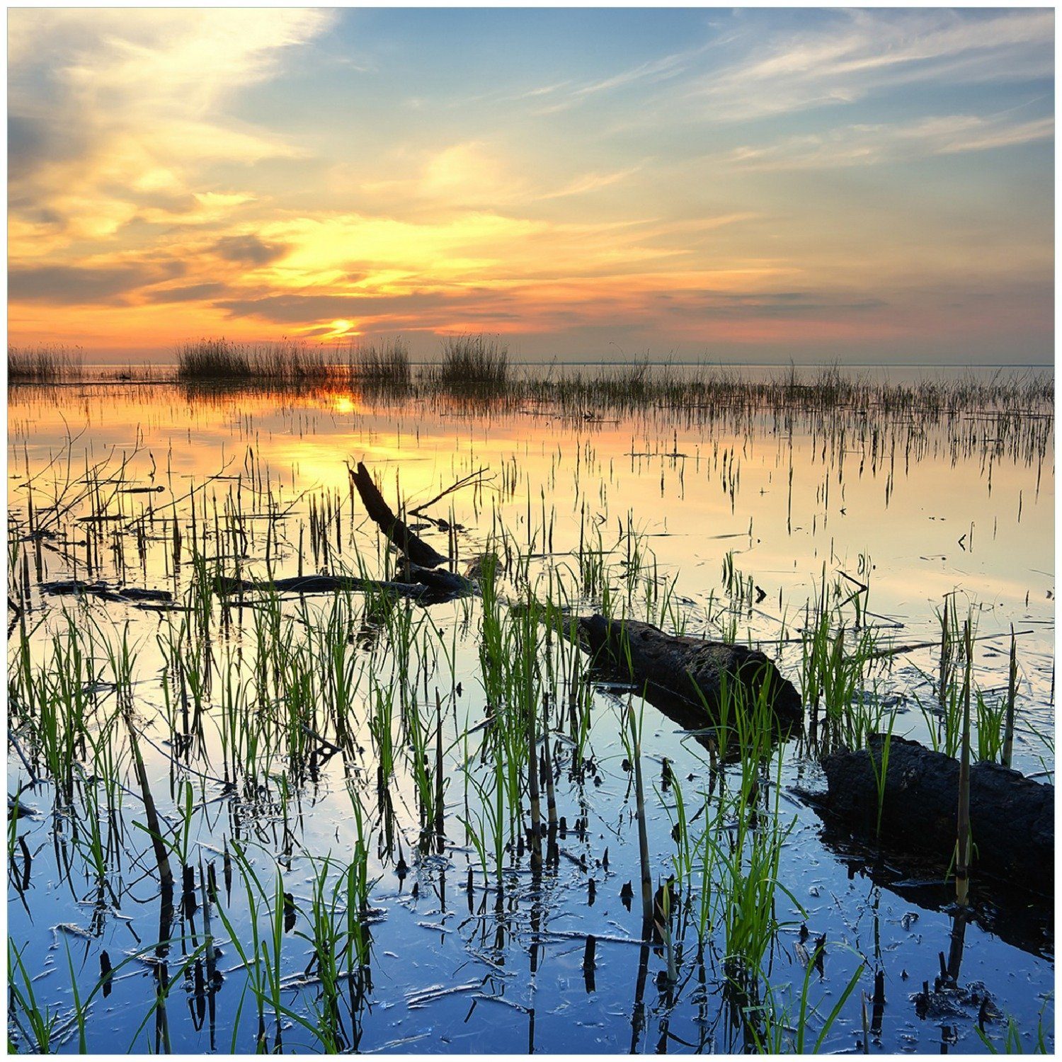 Wallario Memoboard Schilf am Abend - Sonnenuntergang über der Seelandschaft