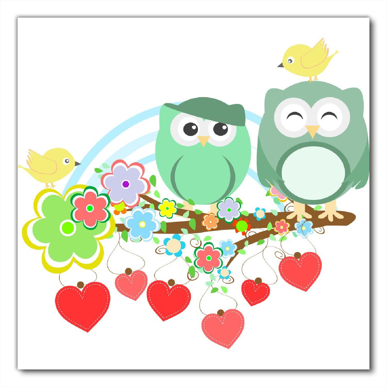 Zwei lustige, grüne Enten sitzen mit zwei gelben Vögeln auf einem Ast. Dieses Motiv im Comic Stil fasziniert mit seinen niedlichen Elementen: Darunter rote Herzen und bunte Blumen. Ein Vögelchen sitzt auf einer der Eulen. Ein schönes Motiv für das Kinderzimmer.