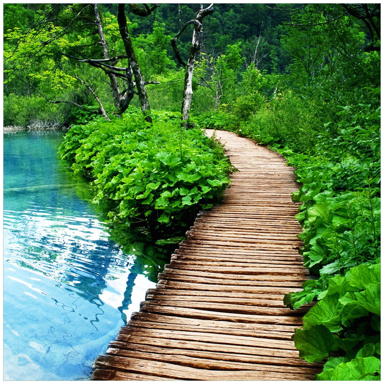 Romantischer Holzsteg über klares blaues Wasser durch einen Wald in den schönsten Grüntönen. Die klare Farbtrennung und der daraus entstehende Kontrast machen dieses Motiv zu etwas besonderem.