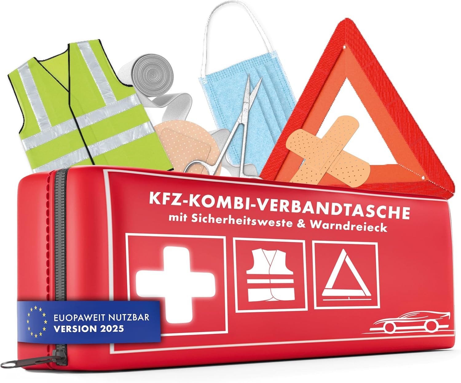 Sicherheit geht vor – mit dem WALSER Erste-Hilfe-Set Auto 2025, das nach der aktuellen EU-Norm DIN 13164:2022 geprüft ist. Dieses hochwertige Verbandsset ist gesetzlich vorgeschrieben in Deutschland, Österreich, Belgien, Luxemburg und vielen weiteren europäischen Ländern. Dank der umfangreichen Ausstattung sind Sie optimal auf Notfälle vorbereitet und können im Ernstfall schnell und kompetent Erste Hilfe leisten. Das Set wurde von vergleich.org mit der Note „Sehr Gut“ ausgezeichnet (Details unter siegel.vergleich.org/XH8HSBB) und ist damit ein zuverlässiger Begleiter für Auto, Freizeit und Haushalt. Umfangreiche 43-teilige Ausstattung – Enthält alles für eine schnelle Erstversorgung: 14-teiliges Pflasterset für kleine Wunden 6 Kompressen, 5 Fixierbinden & 3 Verbandpäckchen für größere Verletzungen 4 medizinische Einweghandschuhe zum hygienischen Arbeiten Rettungsdecke, Schere & Reinigungstücher für zusätzliche Sicherheit Warum dieses Erste-Hilfe-Set? Rechtssicher unterwegs – Erfüllt die gesetzliche Mitführpflicht in vielen europäischen Ländern. Sofort einsatzbereit – Steril verpackte Materialien für hygienische Wundversorgung. Vielseitig nutzbar – Nicht nur fürs Auto, sondern auch für Haushalt, Outdoor-Aktivitäten und Arbeitsplatz.