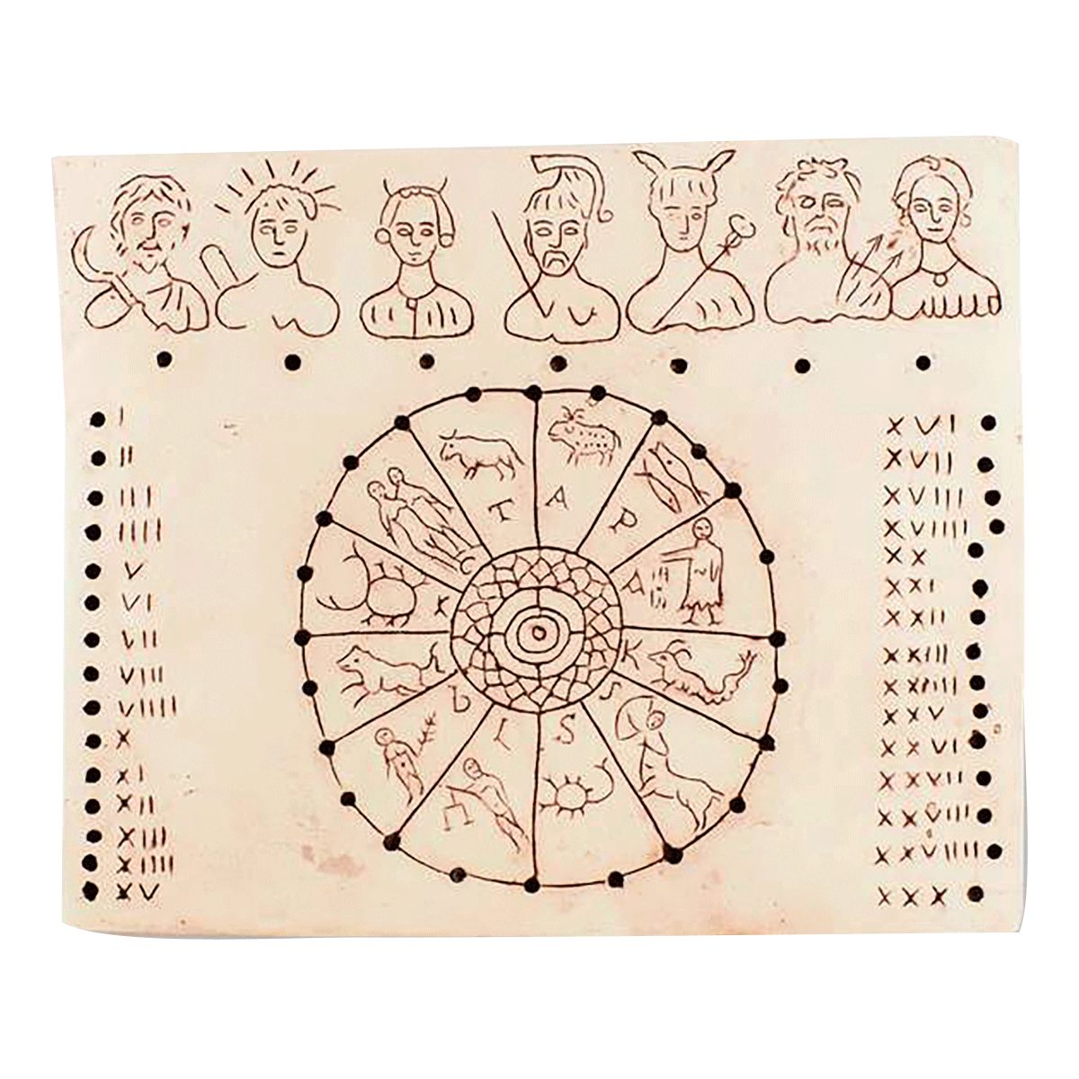 Das Relief zeigt einen antiken Steckkalender aus dem 4. Jahrhundert n.Chr. mit eindrucksvollen römischen Gottheiten, den zwölf Sternbildern und den Wochentagen in römischen Ziffern. Der römische Steckkalender ist eine Replik eines im EUR Museum in Romausgestellten originalen Fundstücks aus Trier. Die Bezeichnung Zodiak entstammt dem lateinischen sowie griechischen Sprachgebrauch und bedeutet Lebewesenkreis, heute Tierkreiszeichen. Innerhalb des Zodiaks liegen die zwölf bekannten Sternbilder der Tierkreise.