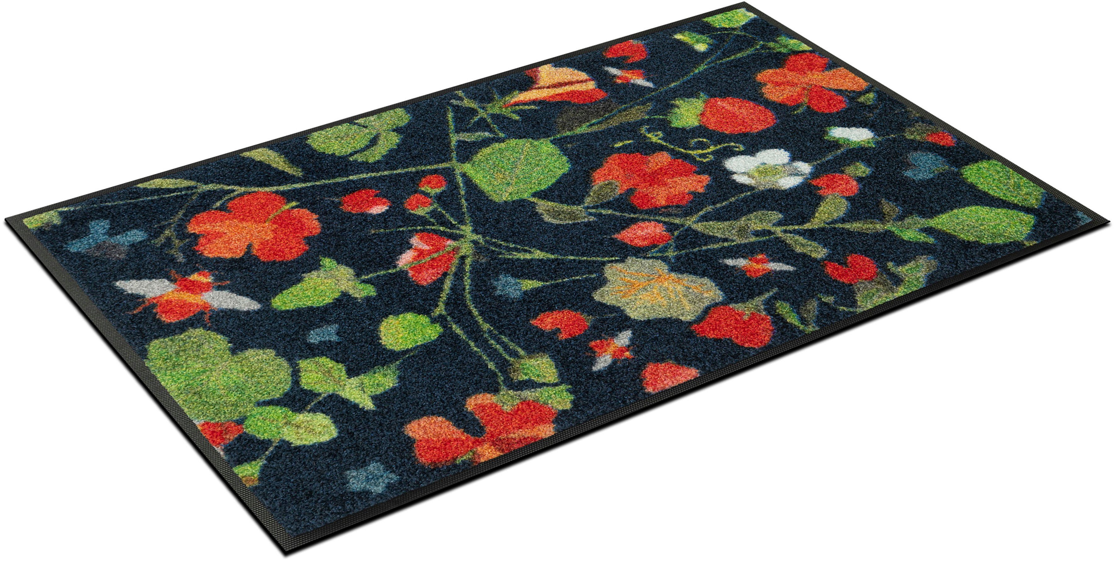 Das wash+dry Design Garden Bee in der Размер 50/75cm ist von der englischen Malerin Julie Dodsworth. Inspiriert vom englischen Landleben und dem Cottage Style zeigt es auf dunkelblauem Hintergrund Efeu- und Erdbeerranken. Die fleißigen Bienchen haben die Erdbeerblüten längst entdeckt und tummeln sich auf der fröhlich und heiter wirkenden Eingangsmatte. Besonders schön passt das Design Garden Bee deshalb im Übergang von der Terrasse oder vom Garten nach Drinnen. Sie ist natürlich ebenso gut geeignet als klassische Fußmatte vor dem Eingang, als Eyecatcher in Flur, Garderobe, Balkon oder Wintergarten – sie ist ein optisches Highlight und nützlicher Helfer zugleich. Neben dem dekorativen Aspekt kommt bei allen wash+dry Matten die Funktion nicht zu kurz. Zuverlässig nimmt der flache, dichte Flor aus Polyamid Schmutz und Feuchtigkeit auch in hoch frequentierten Bereichen auf. Die rutschhemmende Rückenbeschichtung aus Nitrilgummi sorgt für sicheren Stand. Aufgrund der Farbechtheit und Formstabilität kann die Matte einfach in der Waschmaschine (bei maximal 60 Grad) und auch im Trockner (Programm: Mischgewebe) gereinigt werden, um die jahrelange Freude an der Matte zu gewährleisten. Pflegen Sie so Ihre wash+dry Fußmatte 3 bis 4 Mal im Jahr (bei starker Belastung auch häufiger). Für die tägliche Reinigung ist der Teppich leicht zu saugen und auch für den Saugroboter geeignet, da der Flor sehr flach ist. Die Fußmatte ist 100% PVC-frei. Bei PVC-Böden, Linoleum- und Holzböden kann es durch eine Wechselwirkung mit gummibeschichteten Matten zu einer Farbveränderung der Oberfläche kommen. Für alle Produkte behalten wir uns eine produktionsbedingte Toleranz in der Размер von +/- 3% vor. Farbabweichungen können auftreten.