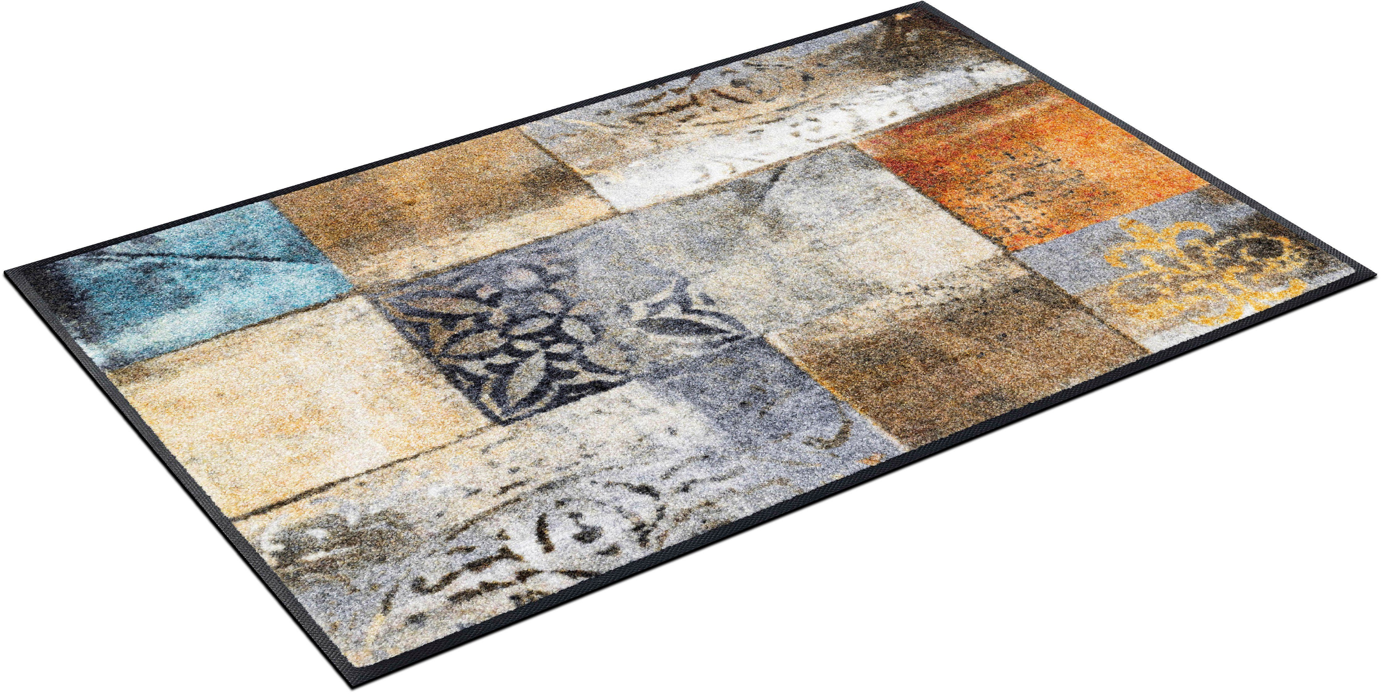 An Fliesenoptik erinnernd, macht sich das Design „Tilea“ zum Blickfang. Eine gelungene Farbkombination aus schlichten sowie kräftig kolorierten Farbstückchen macht die Matte zu einem Kunstwerk für den Fußboden. Individuell einsetzbar als klassische Fußmatte vor dem Eingang, als Eyecatcher in Flur oder Garderobe, aber auch auf Balkonen, Terrassen und in Wintergärten sind die „wash+dry“-Matten immer ein optisches Highlight und nützlicher Helfer zugleich. Neben dem dekorativen Aspekt kommt bei allen wash+dry Matten die Funktion nicht zu kurz. Zuverlässig nimmt der flache, dichte Flor aus Polyamid Schmutz und Feuchtigkeit auch in hoch frequentierten Bereichen auf. Die rutschhemmende Rückenbeschichtung aus Nitrilgummi sorgt für sicheren Stand. Aufgrund der Farbechtheit und Formstabilität kann die Matte einfach in der Waschmaschine (bei maximal 60 Grad) und auch im Trockner (Programm: Mischgewebe) gereinigt werden, um die jahrelange Freude an der Matte zu gewährleisten. Pflegen Sie so Ihre wash+dry Fußmatte 3 bis 4 Mal im Jahr (bei starker Belastung auch häufiger). Für die tägliche Reinigung ist der Teppich leicht zu saugen und auch für den Saugroboter geeignet, da der Flor sehr flach ist. Die Fußmatte ist 100% PVC-frei. Bei PVC-Böden, Linoleum Böden und frisch geölten Holzböden kann es durch eine Wechselwirkung mit gummibeschichteten Matten zu einer Farbveränderung der Oberfläche kommen. Für alle Produkte behalten wir uns eine produktionsbedingte Toleranz in der Размер von +/- 3% vor. Farbabweichungen können auftreten. Die Designserie „Tilea“ gibt es in vier Größen 50/75 cm, 60/85 cm, 75/120 cm und als Läufer in 75/190 cm.