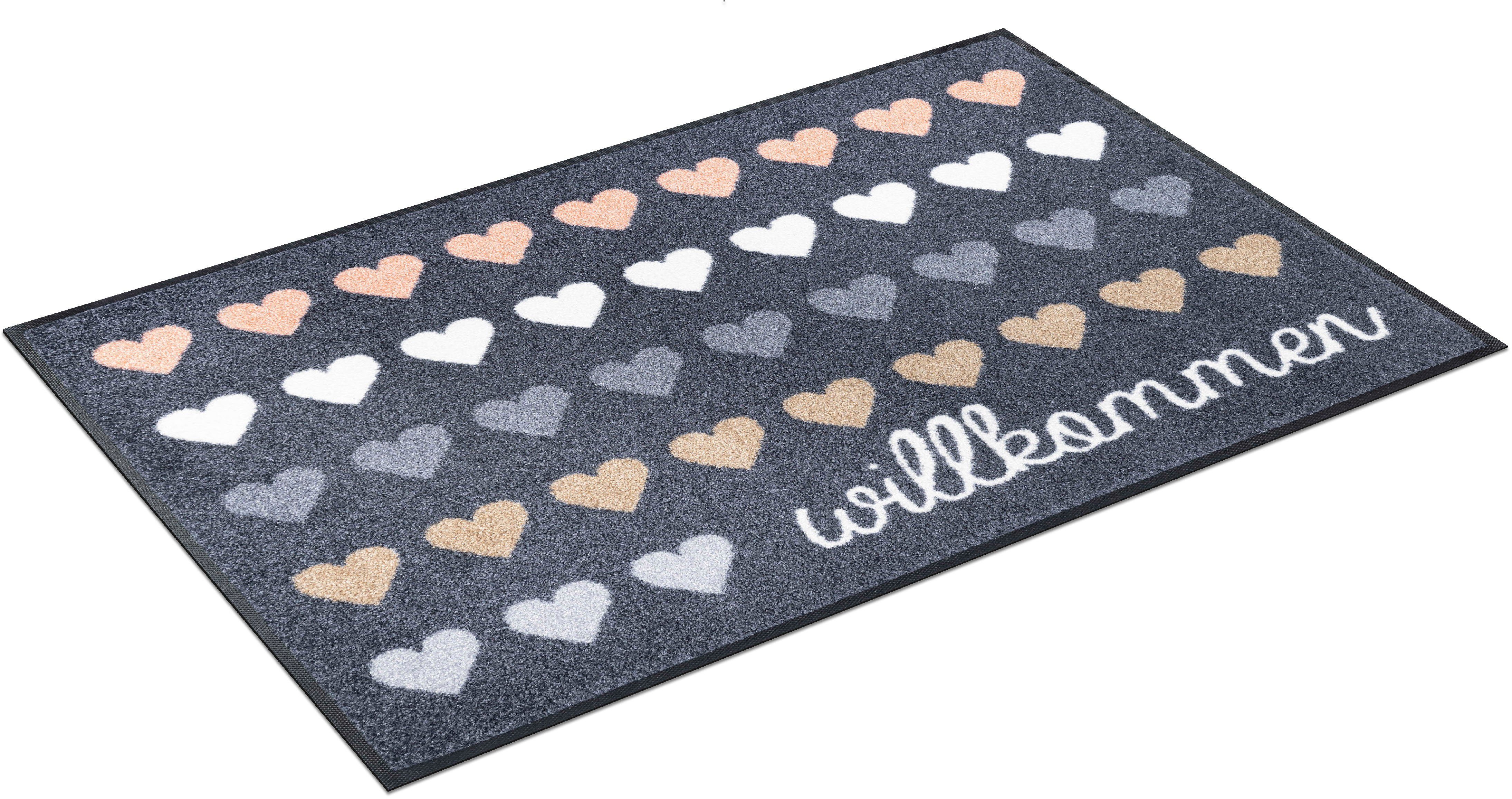 Die Fußmatte sieht sehr schön aus und macht einen hochwertigen Eindruck. Ich hatte ein wenig Bedenken, dass die Farben in echt nicht so schön wie auf dem Foto sind, aber diese waren unbegründet. Die Farben sind kräftig und die Schrift und die Herzen sind deutlich zu erkennen.