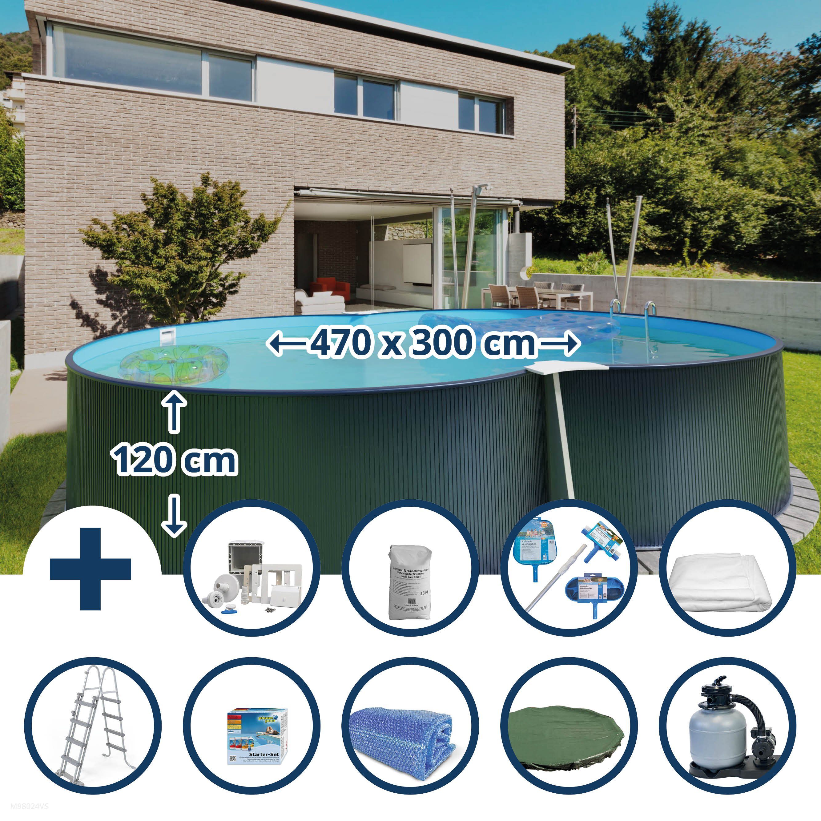 Lieferumfang | Starter Set Wasserpflege Solarplane Abdeckplane Sicherheitsleiter Einbauskimmer Sandfilteranlage SF 124 Stahlwand Innenauskleidung Montagezubehör Sack Filtersand Reinigungs-Set CA Bodenschutzplane Q2 Kombihandlauf Q5 Handlauf |