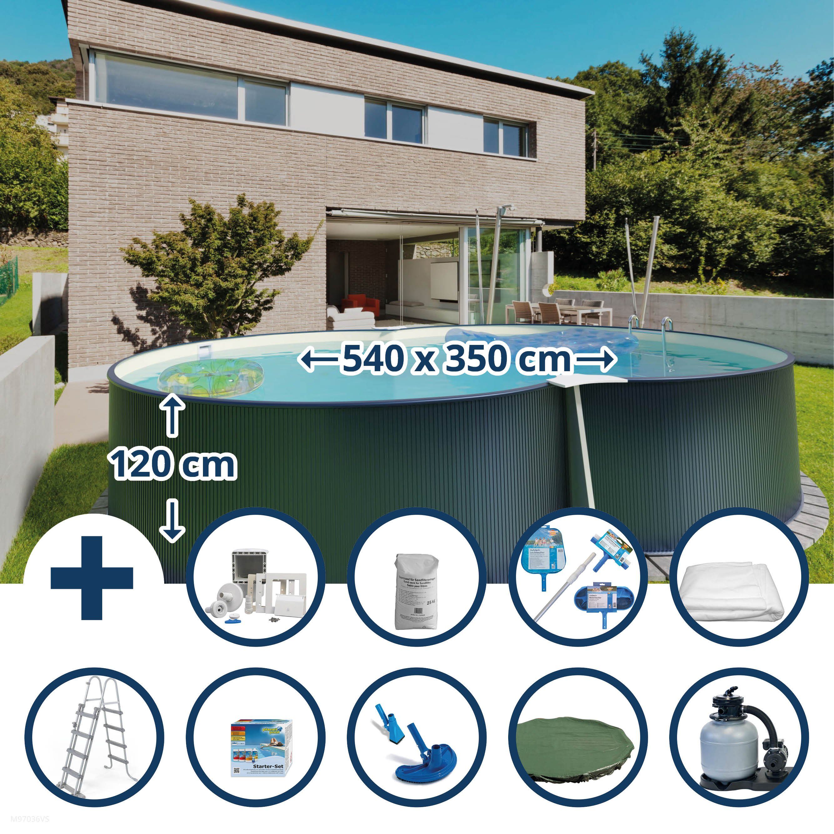 Lieferumfang | Starter Set Wasserpflege Bodensauger Duo Abdeckplane Sicherheitsleiter Einbauskimmer Sandfilteranlage SF 124 Stahlwand Innenauskleidung Montagezubehör Sack Filtersand Reinigungs-Set CA Bodenschutzplane Q2 Kombihandlauf Q5 Handlauf |