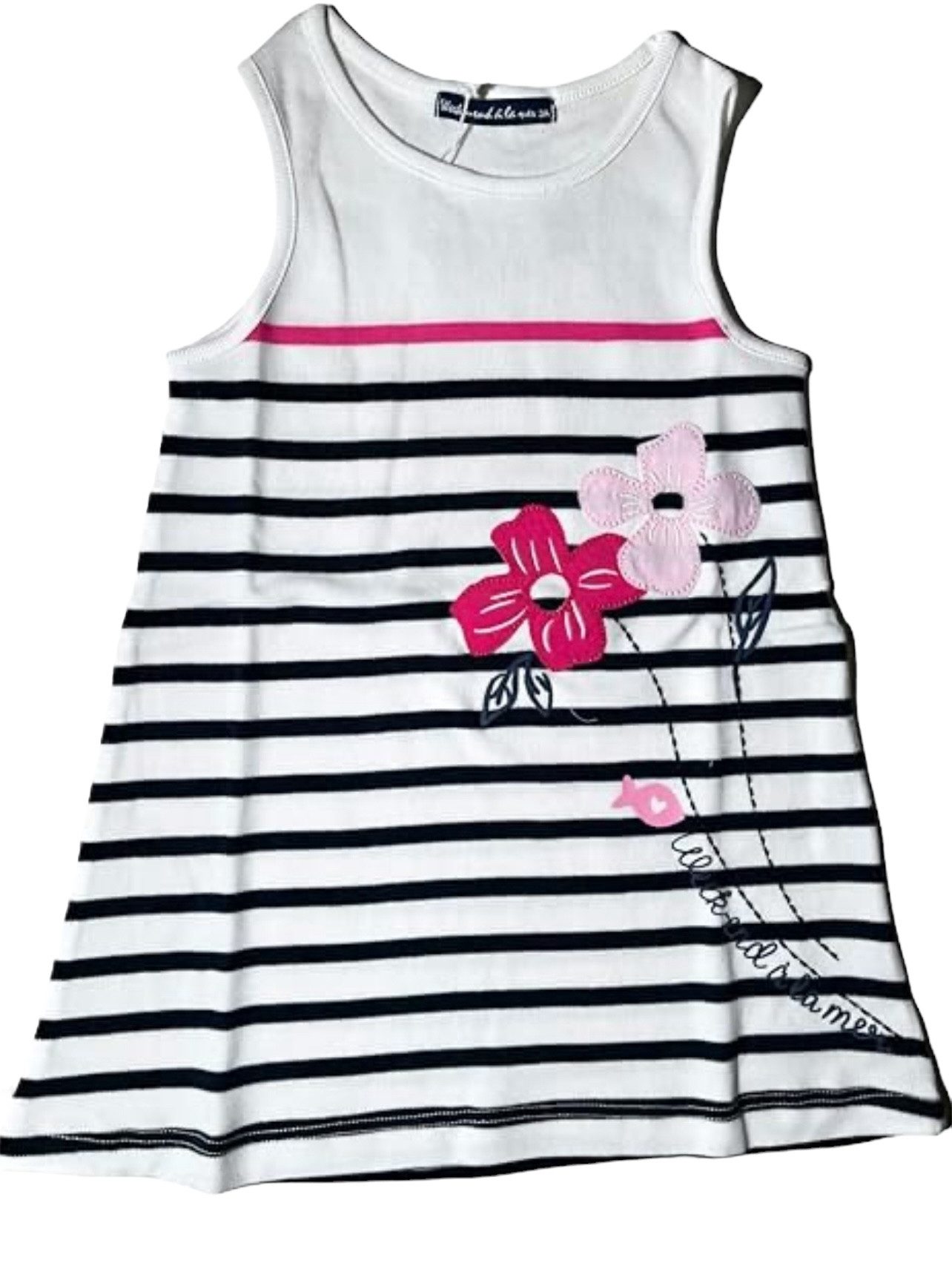 WEEK-END A LA MER – A-Linien-Kleid „Perlerare“ für Kinder – Maritimes Sommerkleid mit Blumenapplikation. Verleihen Sie dem Sommerlook Ihrer Kleinen einen Hauch französischen Charmes mit dem A-Linien-Kleid „Perlerare“ von WEEK-END A LA MER. Dieses liebevoll gestaltete Kinderkleid überzeugt durch sein maritimes Streifendesign in Navy und Weiß, kombiniert mit verspielten Blumenapplikationen in Pink und Rosa. Dank der ärmellosen A-Linienform ist es ideal für warme Tage – luftig, bequem und dennoch stylisch. Die weiche Baumwollqualität sorgt für höchsten Tragekomfort, während die hochwertige Verarbeitung Bewegungsfreiheit garantiert.
