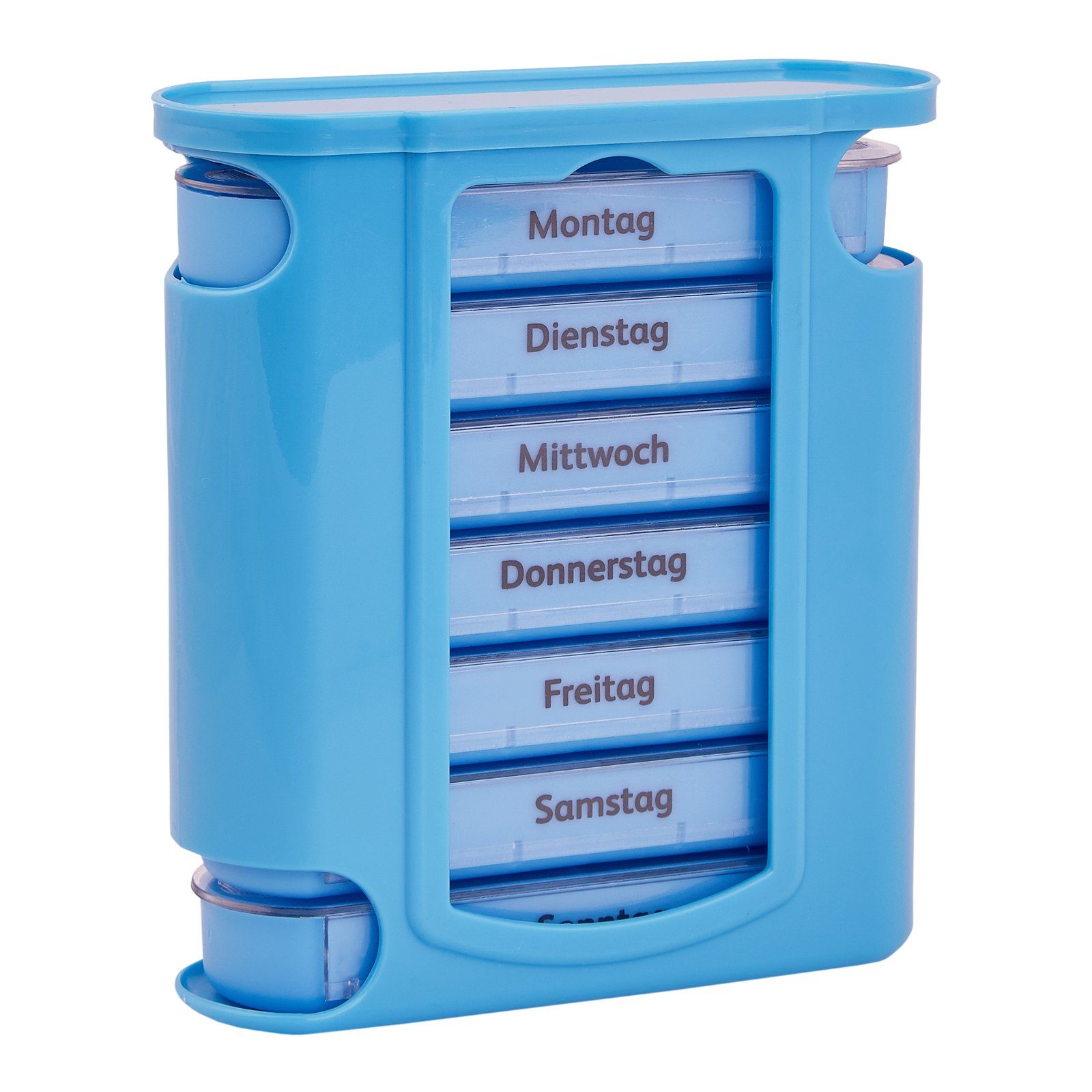 Die mit Wochentagen beschrifteten Tagesfächer können bequem unten aus der Box herausgezogen werden.