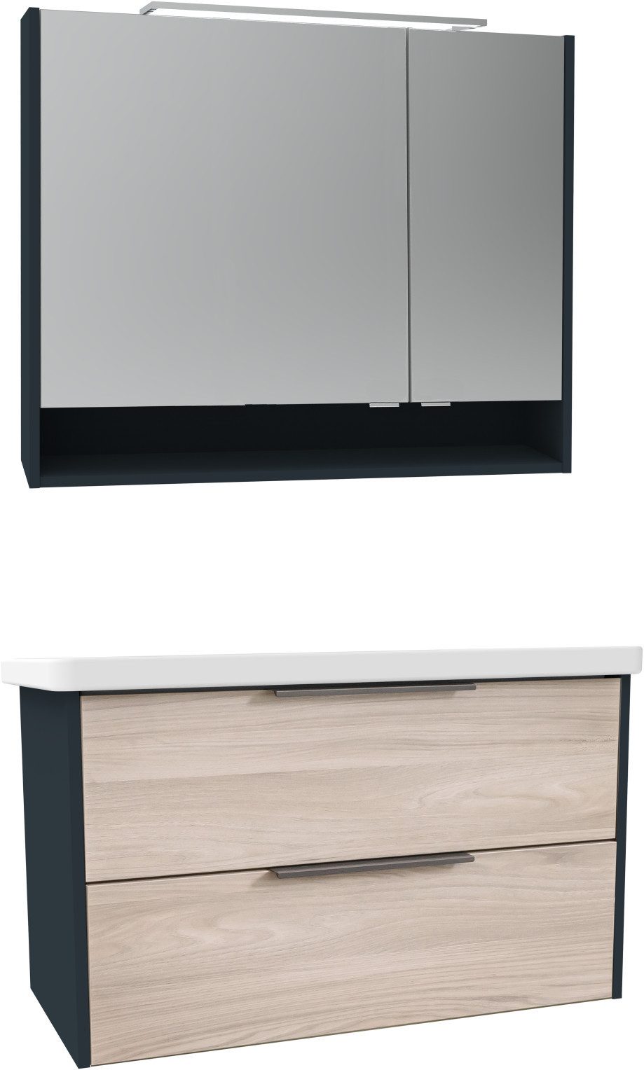 Funktionen | Spiegelschrank mit LED-Aufsatzleuchte, Keramikbecken, Waschtischunterbau mit 2 gedämpften Schubauszügen |