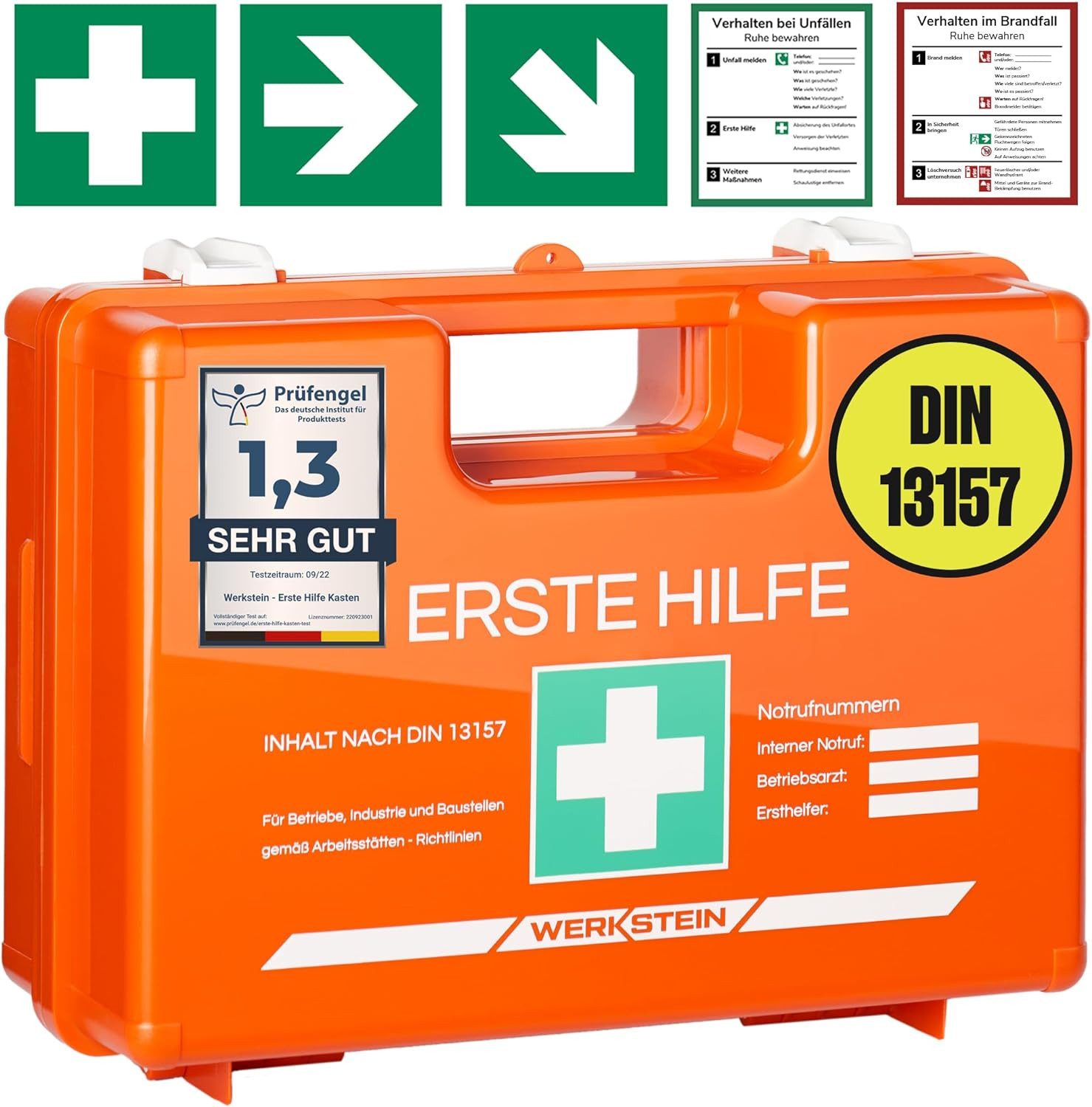 EIN RETTER IM NOTFALL - Bei ernsten Unfällen oder Verletzungen müssen Sie schnell handeln und helfen können, um Verletzte oder sich selbst zu verarzten. Hierfür haben wir speziell den WERKSTEIN Verbandskasten entwickelt, der ein Segen im Notfall ist. VIELSEITIG ANWENDBAR - Unser Erste Hilfe Koffer entspricht der DIN 13157 und wurde nach höchsten Sicherheitsstandards für Medizinprodukte hergestellt. Er eignet sich ideal für die Anwendung in Betrieben mit bis zu 50 Personen oder für Zuhause. SOFORT EINSATZBEREIT - Dank der enthaltenen praktischen Wandhalterung lässt sich der Verbandskasten Zuhause oder im Betrieb einfach an die Wand montieren. Somit ist er im Ernstfall immer gut zugänglich, sichtbar und vor allem schnell griffbereit. ERSTE HILFE ANLEITUNG - Im Notfall erinnern sich vermutlich die wenigsten an Ihren Ersthelferkurs vor mehreren Jahren. Daher enthält der Koffer neben dem insgesamt 91 Teilen eine übersichtliche Anleitung zu lebensrettenden erste Hilfe Maßnahmen. INKLUSIVE 5 AUFKLEBER - Neben dem Erste Hilfe Kasten erhalten Sie noch zusätzlich 5 Aufkleber nach ISO 7010, um für einen Notfall perfekt vorbereitet zu sein. 3 Aufkleber mit Richtungspfeilen, die den Weg zum Kasten zeigen und 2 große Aufkleber für das richtige Verhalten bei Brand- und Unfällen.