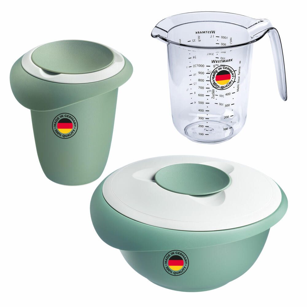 • QUIRLTOPF + RÜHRSCHÜSSEL - zum Mischen und Verrühren von Koch- und Backzutaten sowie zum Steifschlagen von Eischnee und Sahne, geeignet für Rührgeräte und Mixstäbe • VOLUMEN - Quirltopf: 1 l, Rührschüssel: 2,5 l • MESSKANNE - mit Ausgießer zum Abmessen und Dosieren von Back- und Kochzutaten, Füllvolumen: 1 Liter • PRAKTISCH - mit gut lesbarer Messskala in deutsch, englisch, französisch • Maßeinheiten: g Mehl, g Zucker, ml, Liter, fl.oz, pints • platzsparend ineinander stapelbar • LIEFERUMFANG: 1x Westmark Back-Set, 3tlg., Material: Kunststoff (PP/PE/SAN), Farbe: Mint-Grün/Weiß/Transparent/Schwarz, WP0311AO • Pflegehinweis: spülmaschinengeeignet Длина: 24,5 cm Breite: 22,5 cm Höhe: 14,2 cm