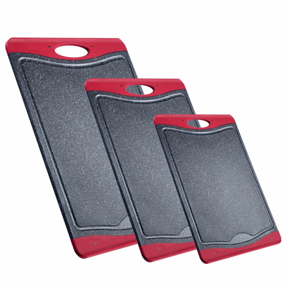 • 3 rutschfeste und klingenschonende Schneidunterlagen in 3 unterschiedlichen Größen: 29x20/36,5x25/44,5x30 cm, zum Schneiden und Verarbeiten von Obst, Gemüse, Fleisch und Fisch • Rote Randelemente mit Verstärkung an den Enden aus rutschfestem Material für festes Aufliegen auf der Arbeitsfläche und sicheres Arbeiten, mit Aussparung als Griffelement • Besonders hygienisch, keine geruchs- und geschmacksannahme, klingenschonend durch schnittfeste Oberfläche, umlaufende Saftrille zum Auffangen der Flüssigkeiten, große Größe • Langlebig, Sorgfältig solide Verarbeitung, einfache Reinigung, spülmaschinengeeignet, schmale Maße zur platzsparenden Aufbewahrung • Pflegehinweis: spülmaschinengeeignet