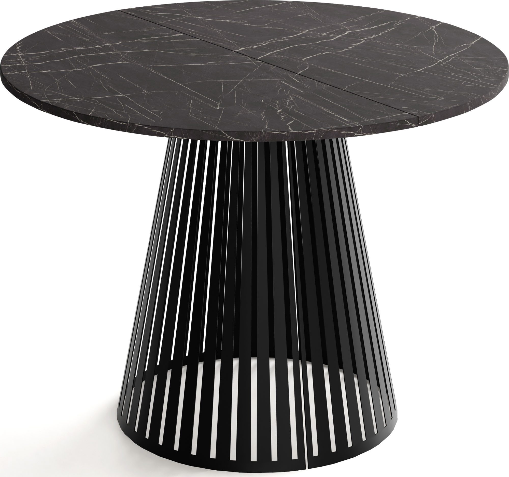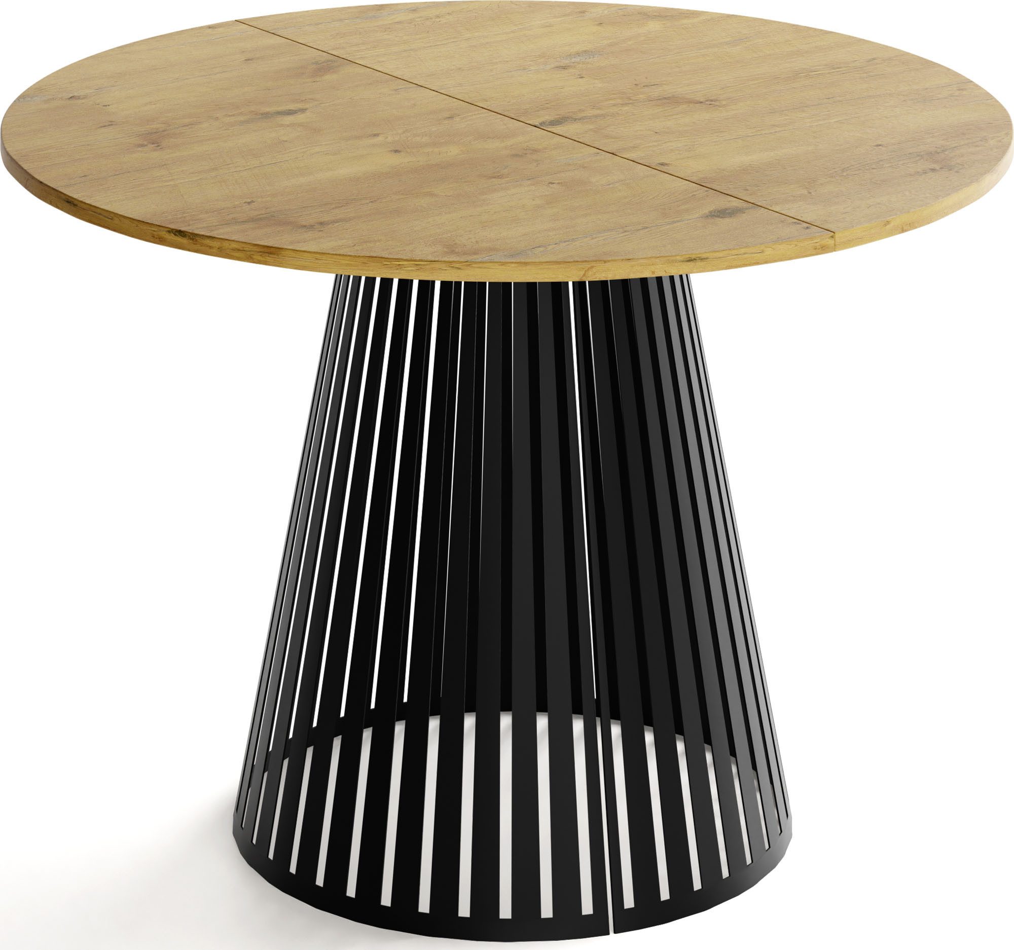 Der Esstisch Naro kombiniert zeitgemäßes Design mit praktischer Erweiterbarkeit. Die runde Tischplatte lässt sich im Handumdrehen zu einer großzügigen ovalen Tafel ausziehen – perfekt für gesellige Abende. Das auffällige, skulpturale Gestell aus schwarzen Metallstreben verleiht dem Tisch eine moderne, architektonische Note und sorgt gleichzeitig für Stabilität und Beinfreiheit.