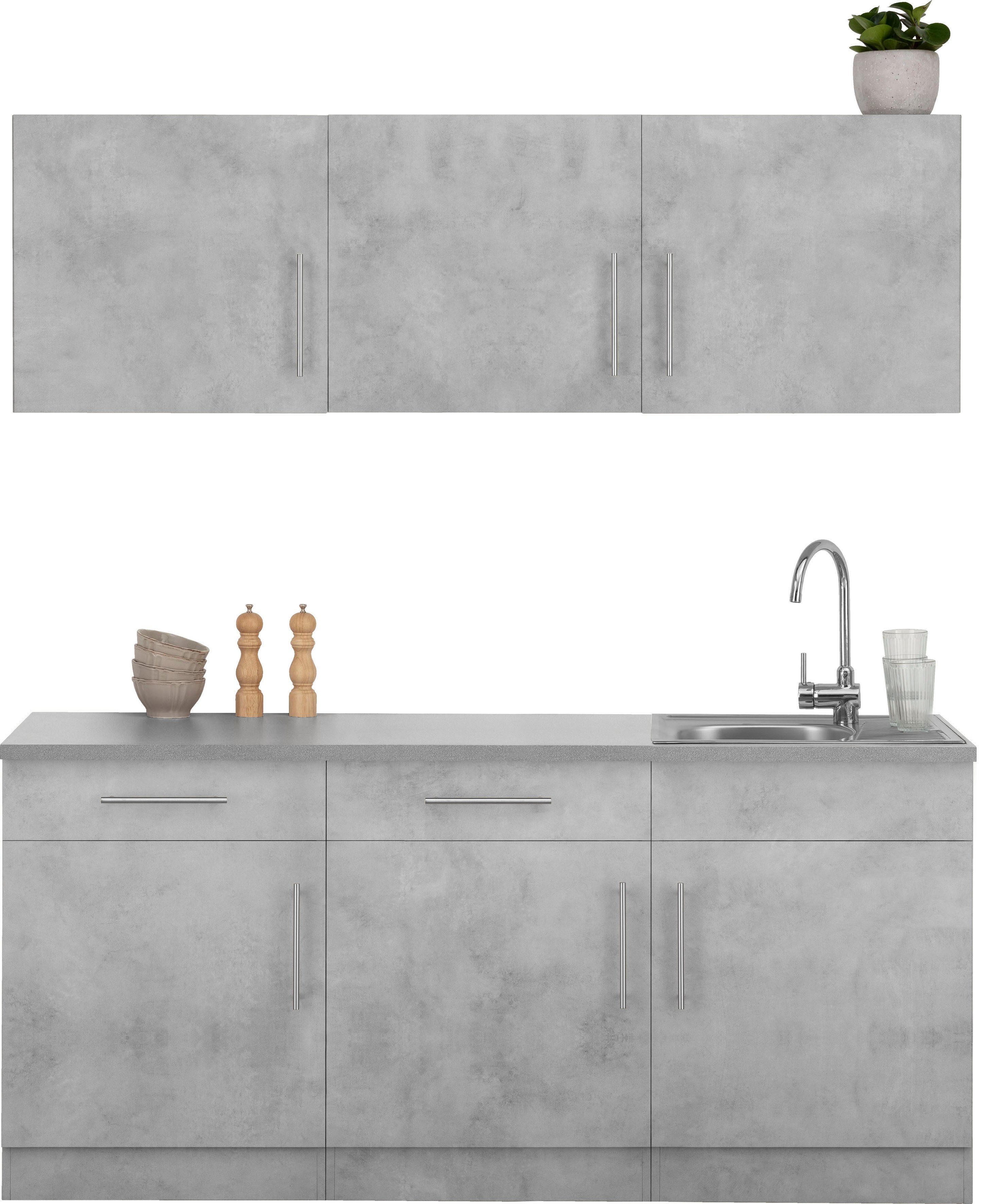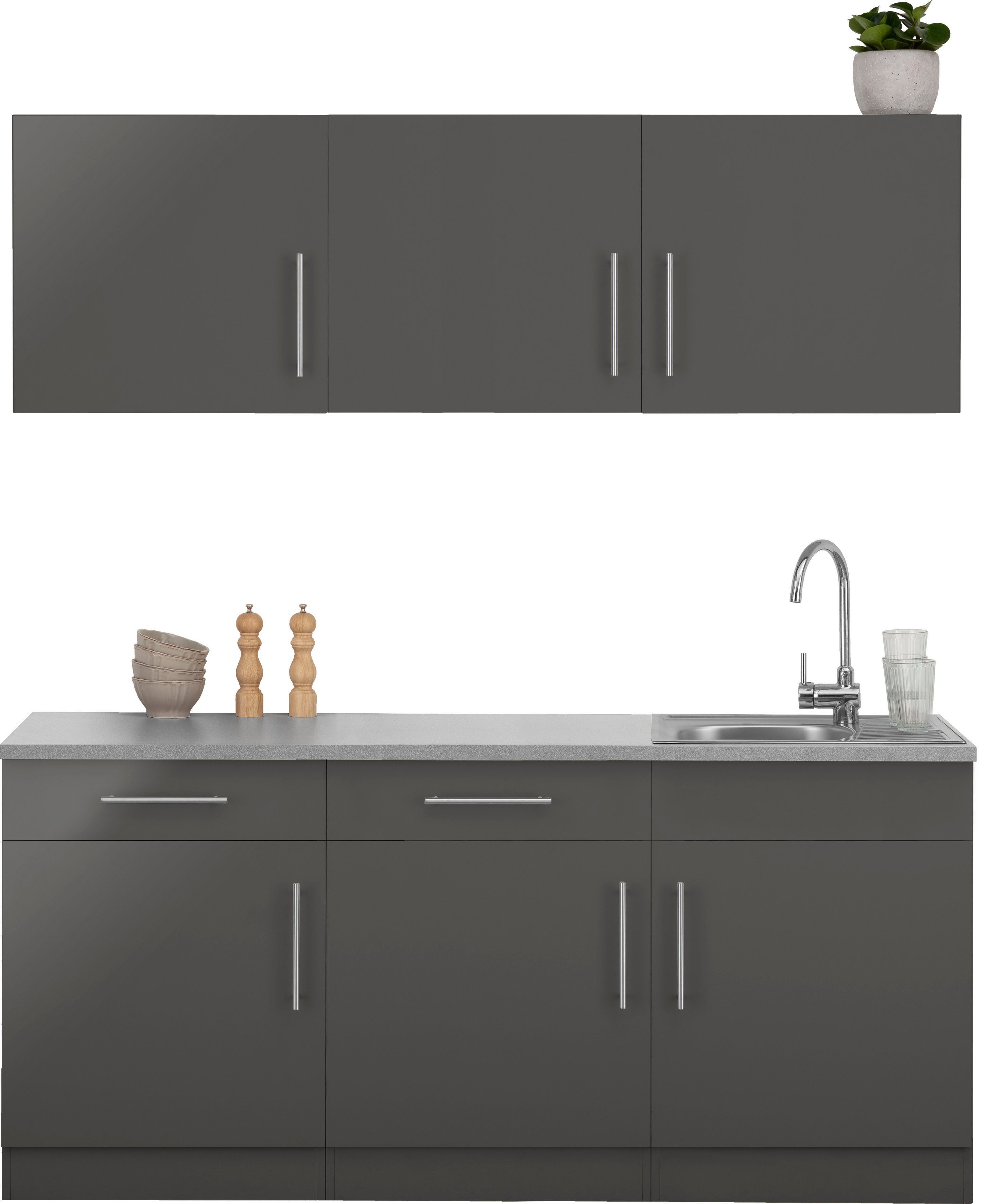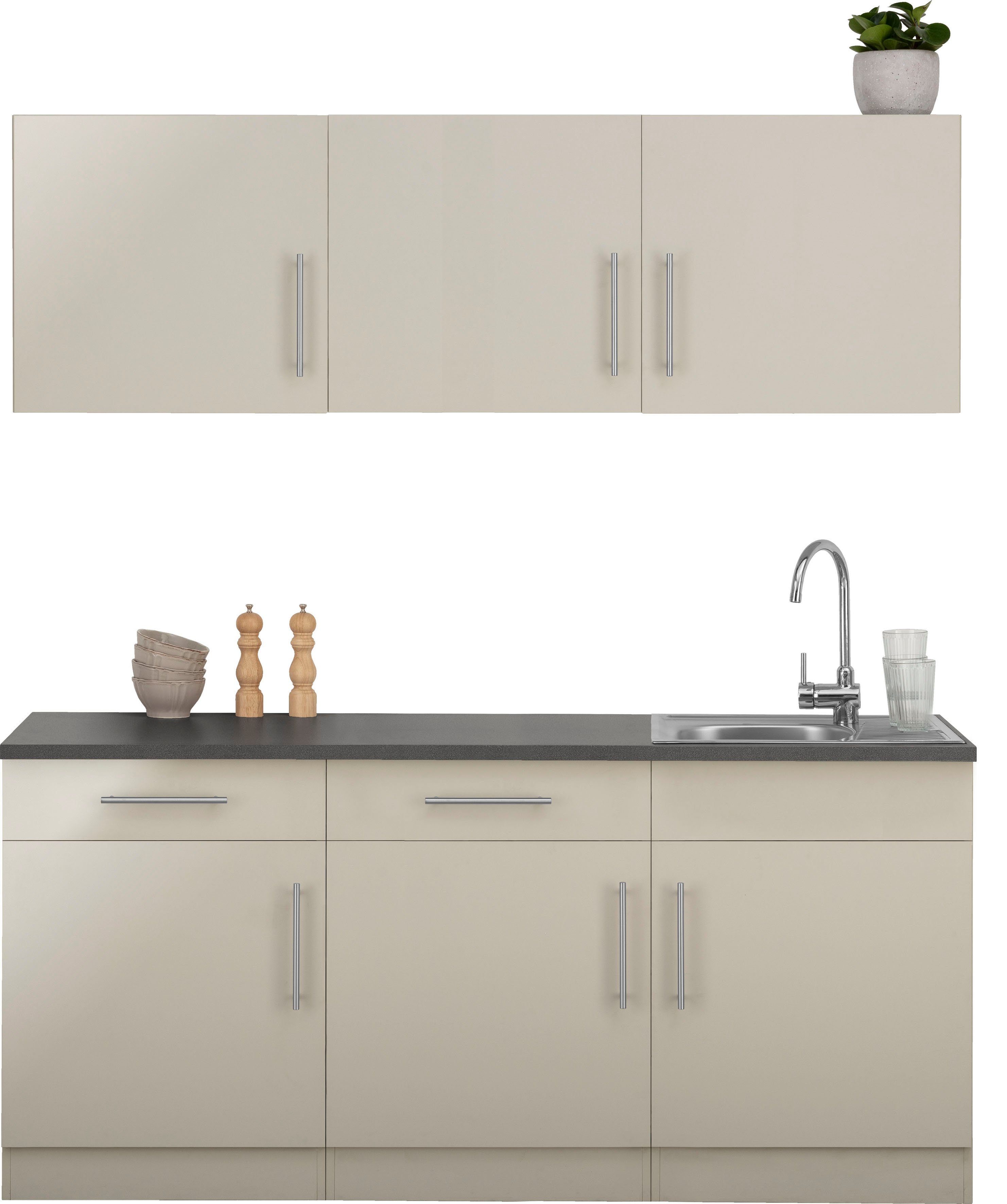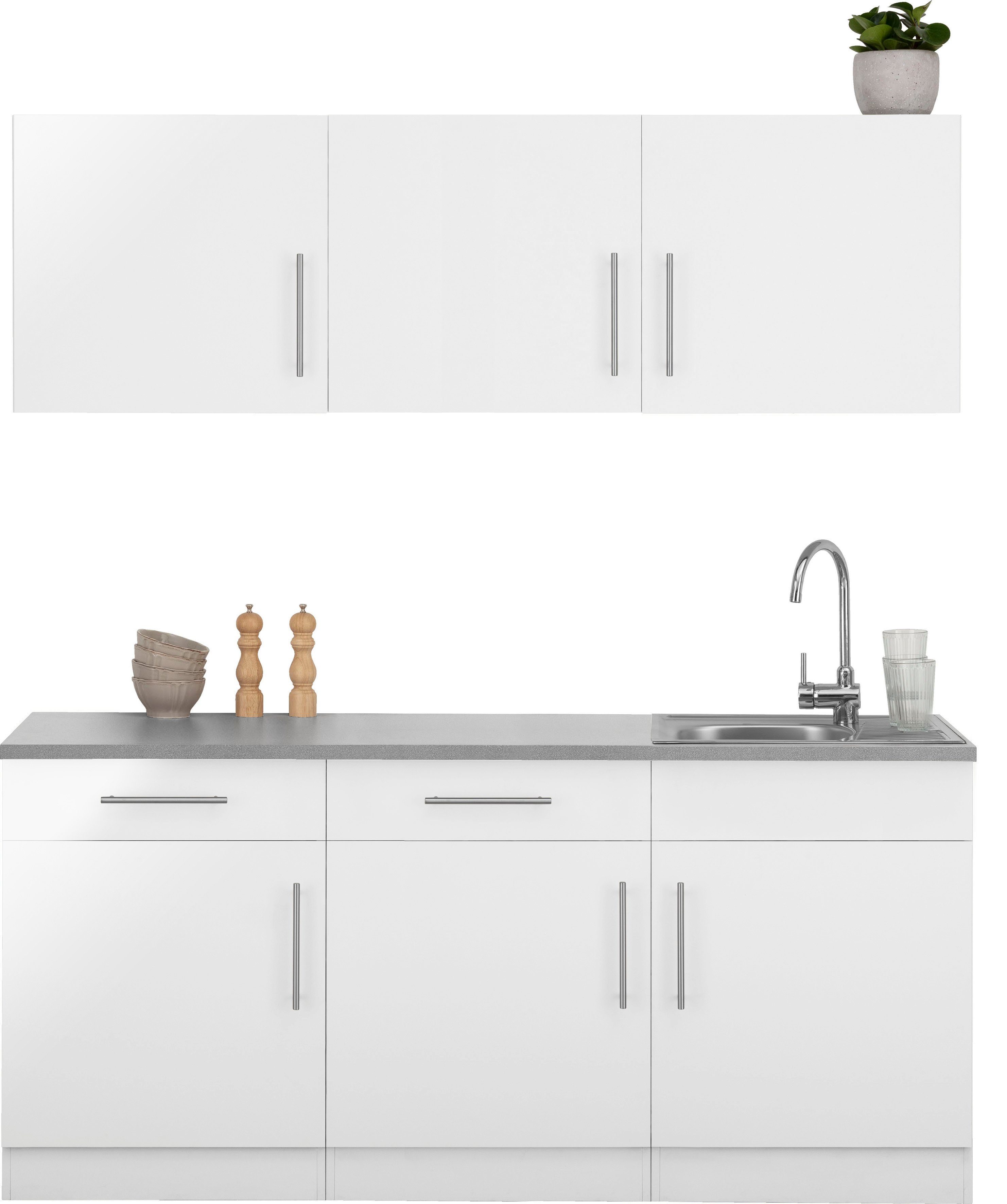 Ausstattung | Durchgehende Arbeitsplatte Einlegeböden höhenverstellbar Laufleisten der Schubkästen aus Metall Metallgriffe Sockelhöhe nicht verstellbar Türen wahlweise rechts/links montierbar inkl. Edelstahl-Einbauspüle, mit Abtropffläche |