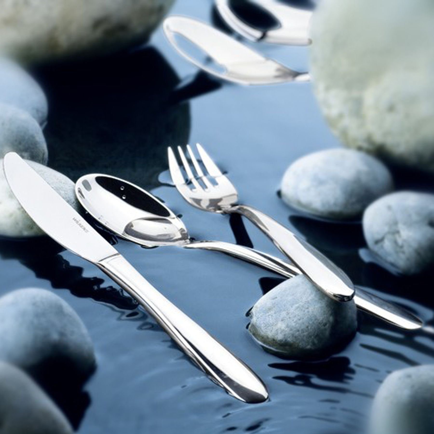 Wilkens Besteck ROTONDO POLIERT 62-tlg.in 18/10 Edelstahl Besteckgarnitur Spannungsvolle, klare Linien, ausgewogene Proportionen, geschmeidige Übergänge und ideal ausbalancierte Materialverteilung charakterisieren diesen Entwurf. WILKENS Rotondo überzeugt durch die Synthese von gleichzeitig neu und vertraut erscheinenden gestalterischen Elementen. Все Teile sind in die Hand geformt und machen den Umgang mit dem Besteck zu einem haptischen Vergnügen. Design: Walter Storr, 1996. Edles Besteckset von WILKENS in Edelstahl für 6 Personen: Je 6 Messer (Hohlheft), Gabel, Löffel in Menügröße; Messer, Gabel, Löffel für Dessert; Kaffeelöffel, Espressolöffel, Kuchengabel, 2 Fleischgabel, 3 Vorlegelöffel, Saucenlöffel, Tortenheber, Zuckerlöffel.